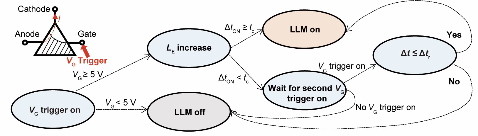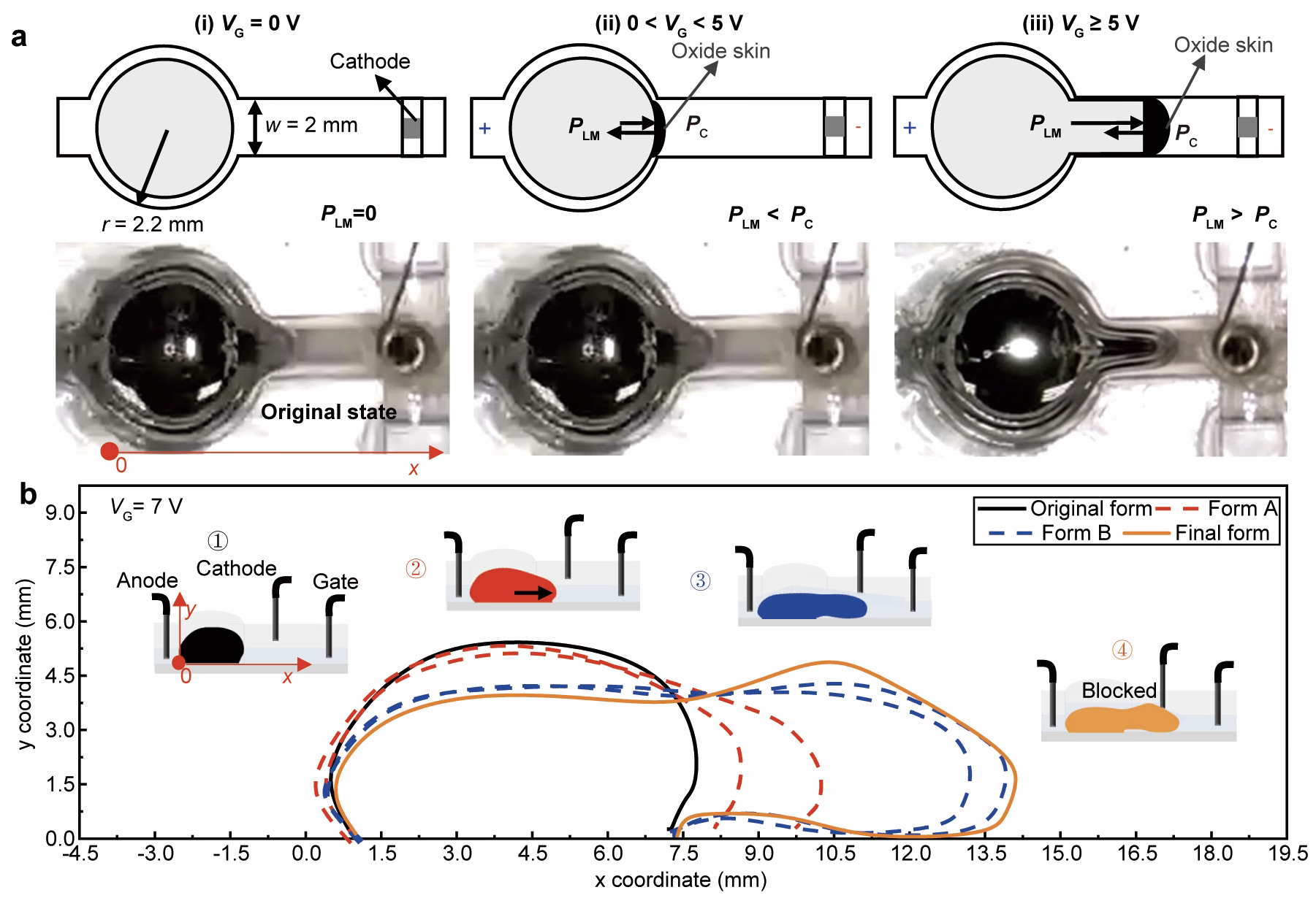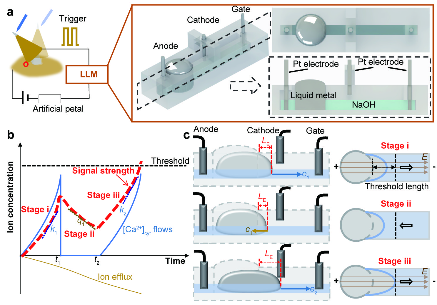 基于捕蝇草内部电信号积累/衰减模型,作者提出了一种基于液态金属丝延伸/缩短形变的电子逻辑元件LLM。该元件以氢氧化钠溶液中的液态金属丝为导电介质,基于电化学及电毛细效应控制液态金属丝的长度,进而依据阳极和门极所施加的电刺激调控阴极输出。通道中液态金属丝长度变化的时间依赖性机制赋予了LLM独特的记忆性能。