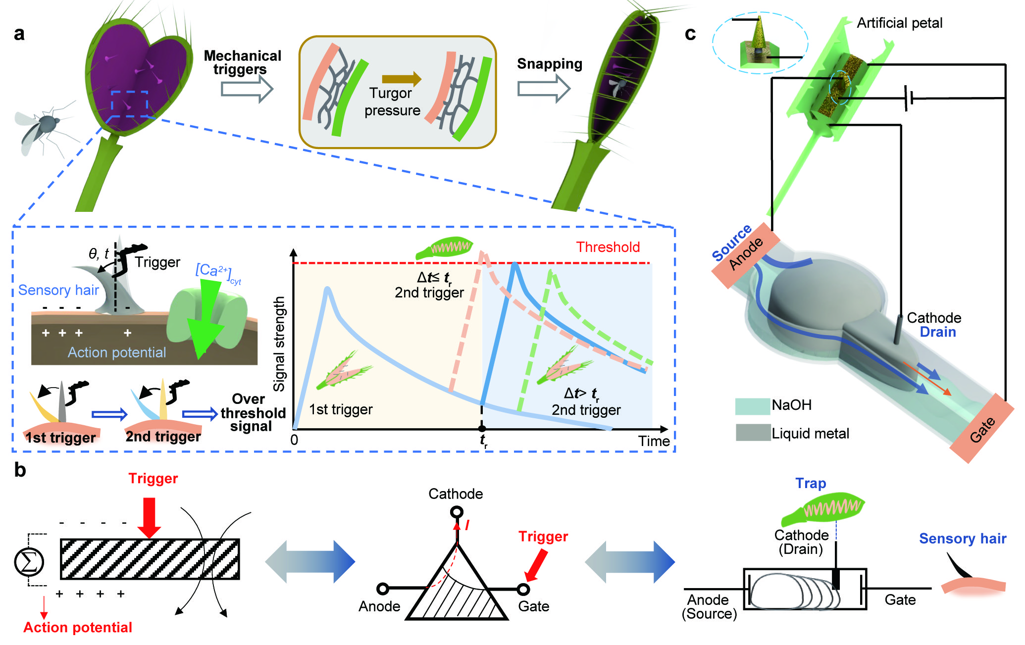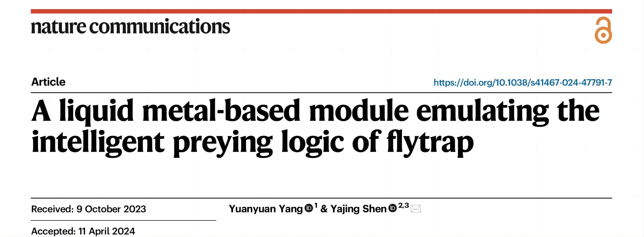 近日,我院重大装备健康管理研究团队杨媛媛副教授与香港科技大学申亚京教授团队合作,提出了一种基于液态金属的仿捕蝇草智能捕食机制的电子逻辑元件,该元件本身具有记忆和计数特性,无需其它辅助电子器件即可如捕蝇草般智能地响应各种刺激序列。基于材料自身而实现的智能策略以及内在的逻辑机制,为思考自然界中的“智能”提供了全新的视角,也对“具身智能”的发展提供了启发。该研究成果以“A Liquid Metal-based Module Emulating the Intelligent Preying Logic of Flytrap”为题发表于《自然·通讯》(Nature Communications)期刊。