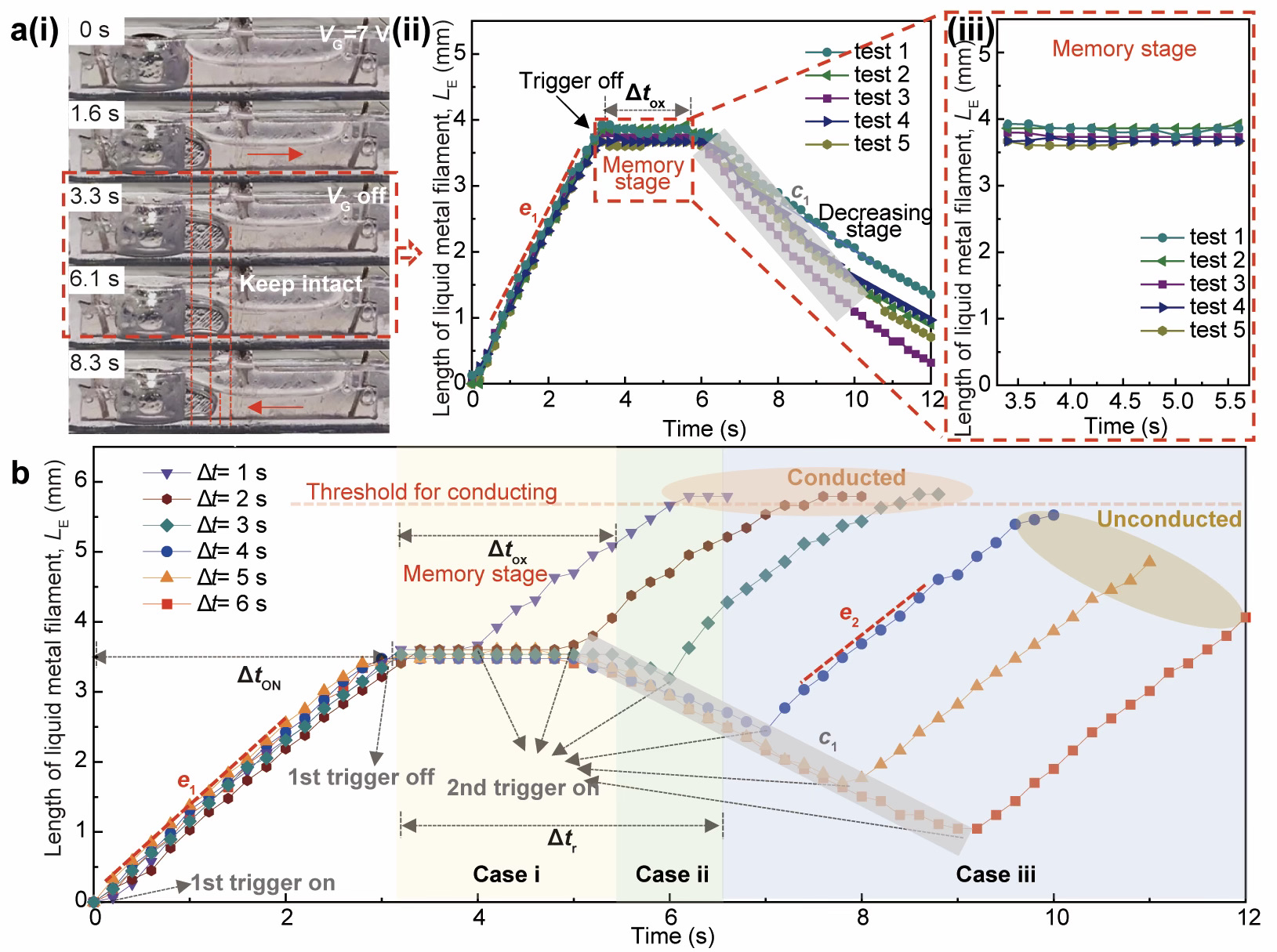 LLM接收电刺激后液态金属丝的长度如同捕蝇草中钙离子信号般增强,当撤掉电刺激后由于由于液态金属与通道的粘附作用,它在一定时间内保持不动后将逐渐减小。该特性使LLM能够短时间保留液态金属丝的长度记忆,并在接收到第二个触发信号时在此基础上延长。