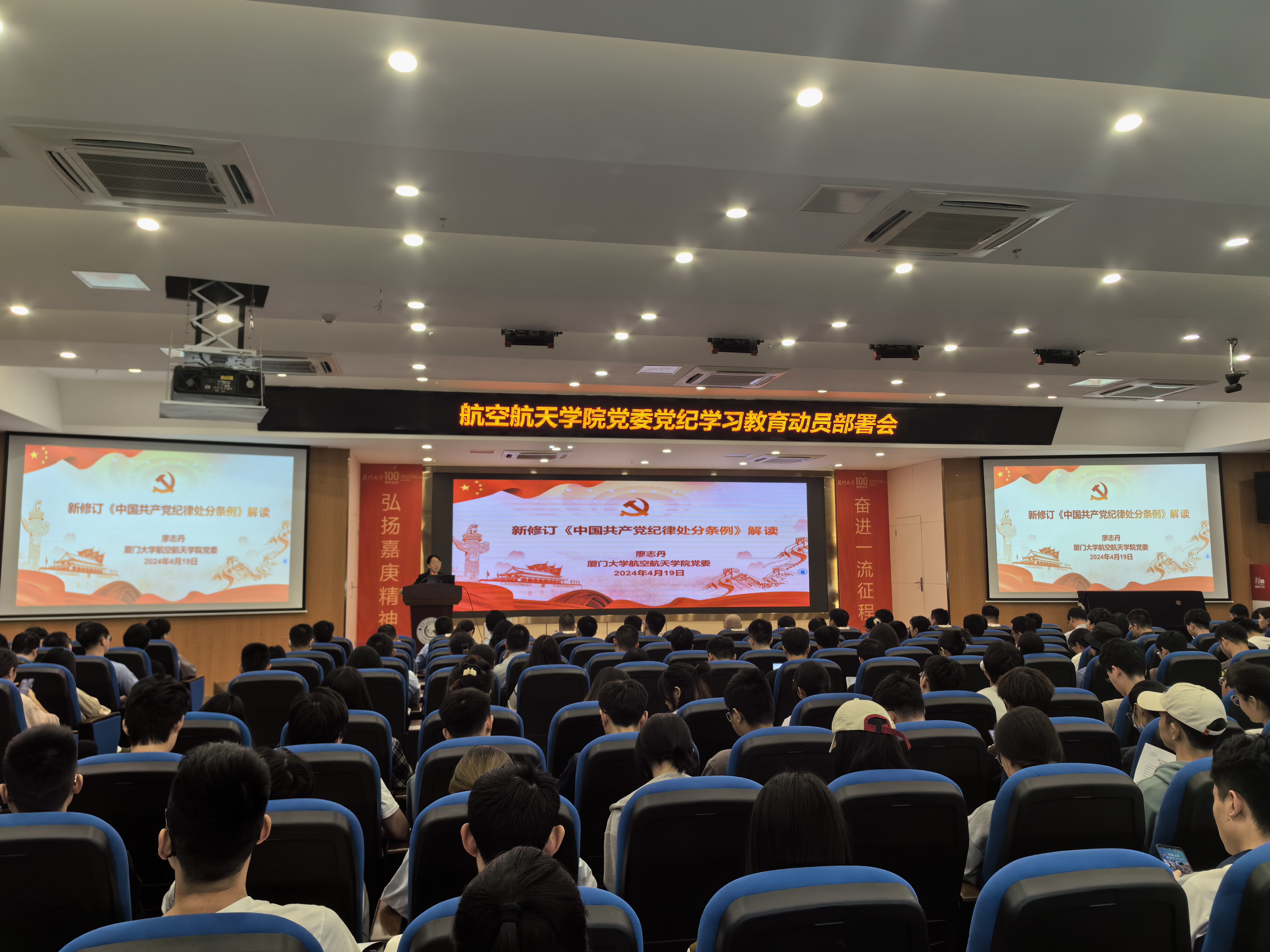 4月19日,航空航天学院党委在航空航天大楼报告厅召开党纪学习教育动员部署会。航空航天学院党委书记廖志丹做动员部署并开展专题党课。校基层党建工作联络员邵鹏飞莅临会议指导。航空航天学院、萨本栋微米纳米科学技术研究院处级党员领导干部、学院党委委员,师生党支部书记、支委,党员师生代表等参加会议。