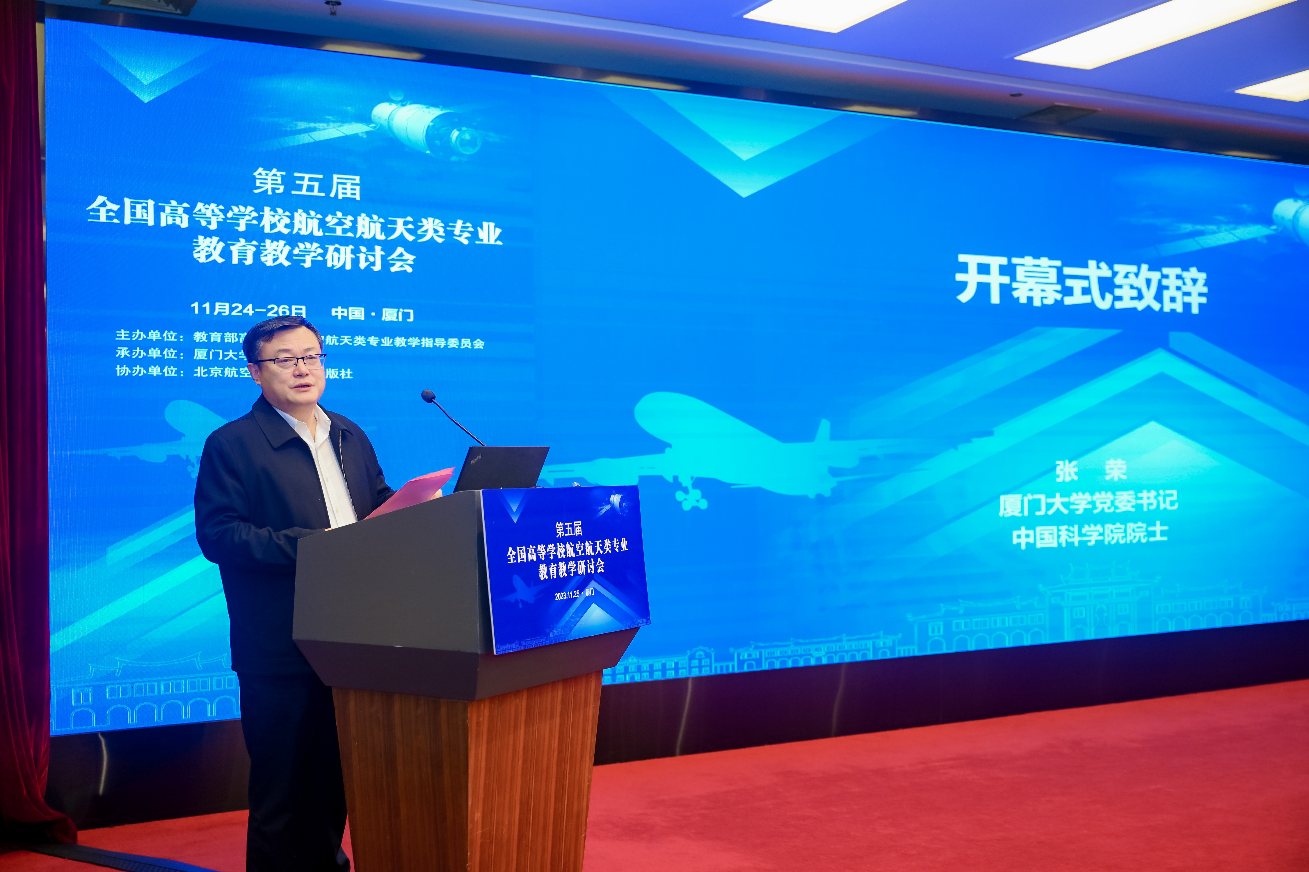 开幕式上,厦门大学党委书记、中国科学院院士张荣教授代表学校致欢迎辞。张荣书记在致辞中介绍了厦门大学航空航天学院学科专业发展概括并指出,国家正大力推进新型工业化建设,航空航天科技迎来了前所未有的发展机遇,此次研讨会是为落实全国教育大会精神和新时代全国高等学校本科教育工作会议精神而举办的一次高水平教育教学研讨会。开幕式由厦门大学航空航天学院常务副院长、教指委委员尤延铖教授主持。