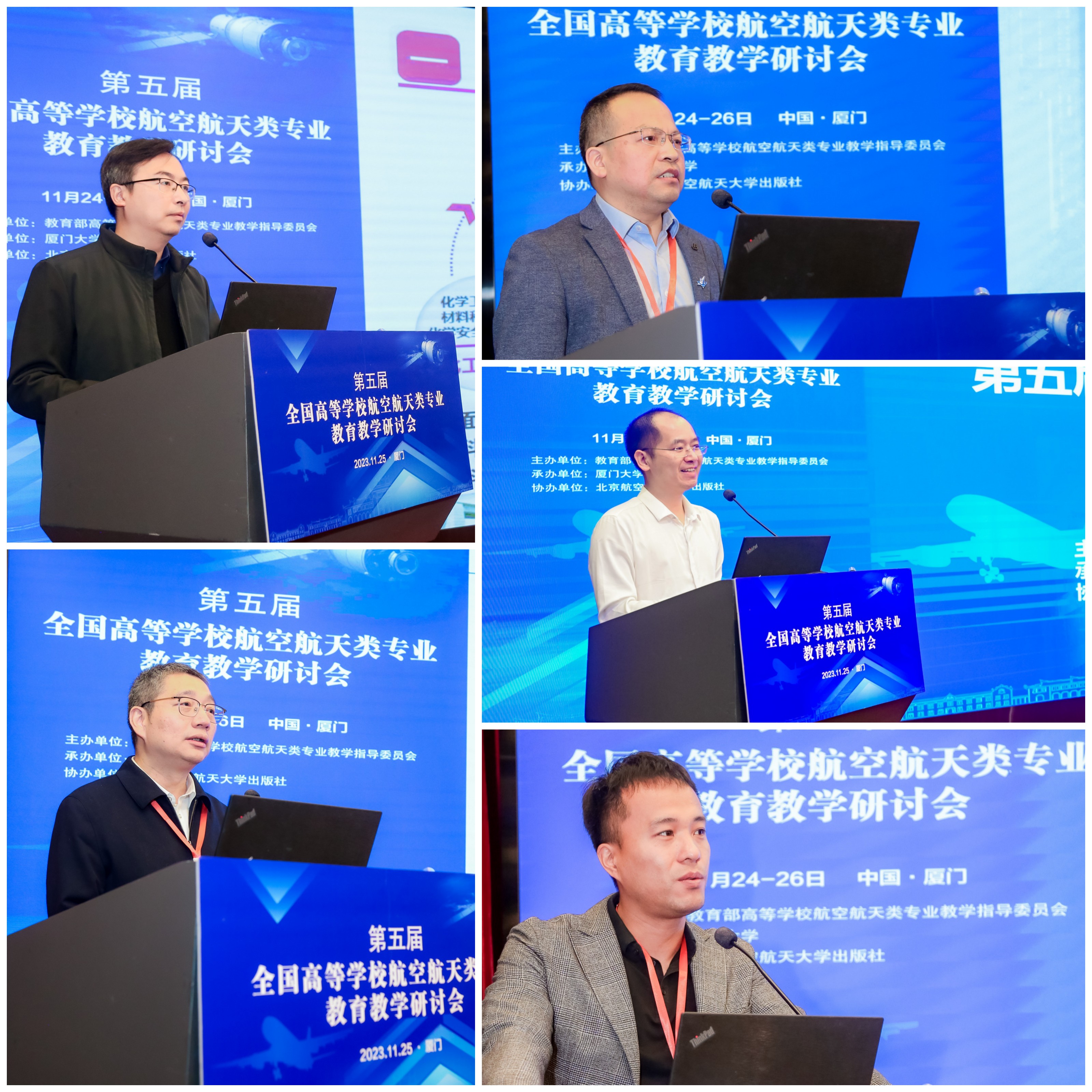 南京理工大学郑侃教授(代表教指委副主任委员廖文和教授),南昌航空大学副校长郭正华教授,西北工业大学动力与能源学院郑光华教授,厦门大学航空航天学院常务副院长尤延铖教授,北京凌空天行科技有限责任公司副总沈海滨等6位嘉宾分别以《航空航天卓越工程师人才培养的探索与思考》《三向四合五制”航空类拔尖人才培养模式探索》《中俄 2+2 本科联合培养“凌云班”探索与实践》《综合性大学的交叉-融合-创新型新一代空天人才培养体系创建与实践》《“空天报国”校企联合人才培养的探索与实践》为主题就航空航天领域的教学改革探索和空天科技发展趋势进行了深入剖析和展望,相关报告分析了中国航空航天企业对航空航天人才培养需求,论述了传统航空航天强校和综合性大学在培养多层次多类型空天人才的实践经验和成果。他们精彩的演讲和深入的解析,使与会者对航空航天类专业教育教学内涵和外延有更深入的了解和认识。