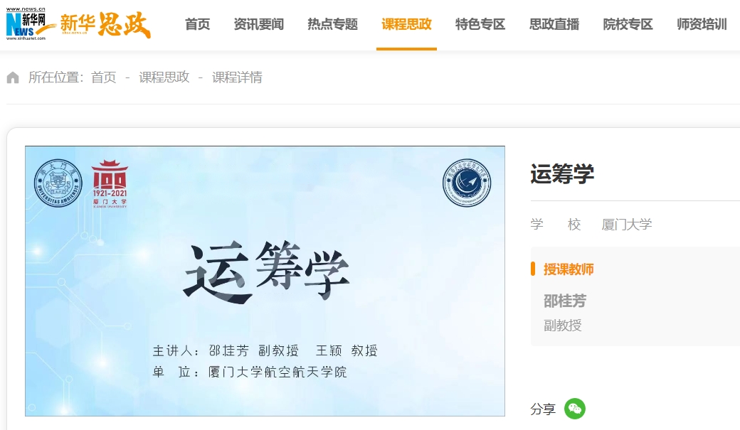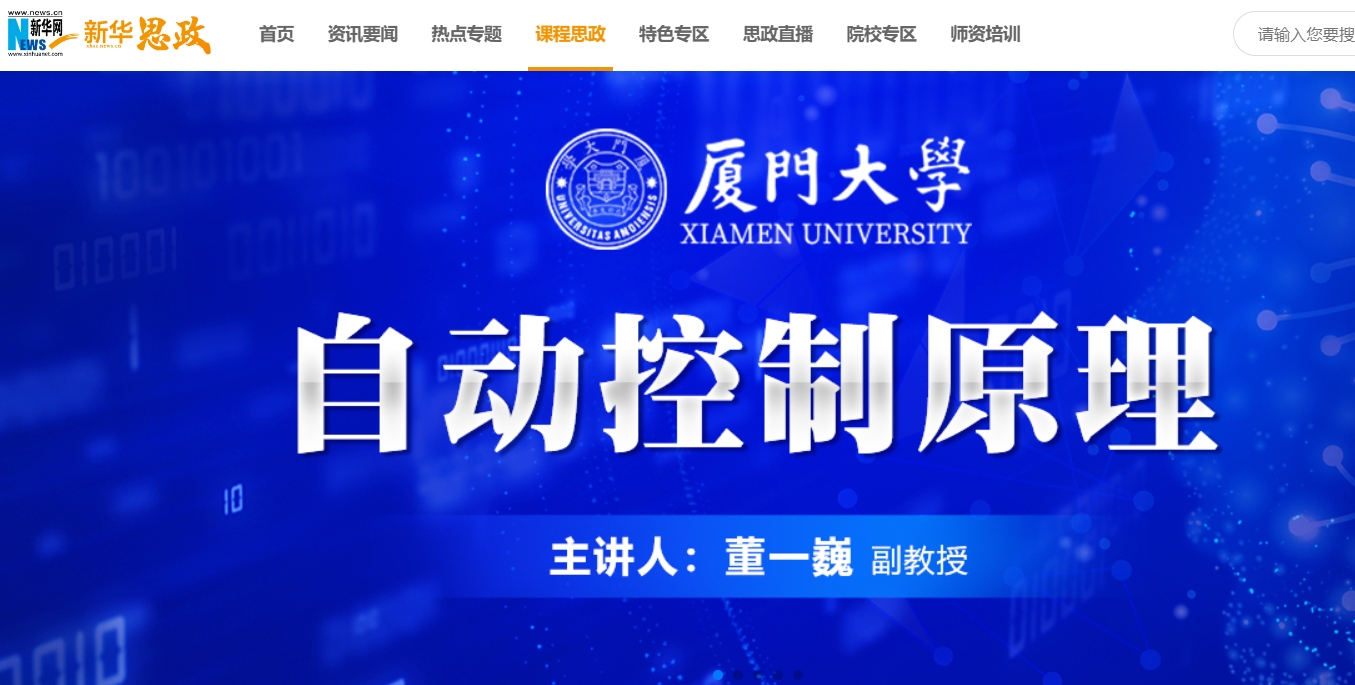近日,厦门大学航空航天学院的《自动控制原理》和《运筹学》两门课程思政示范课程在新华网“新华思政”平台上线,《自动控制原理》更是被选为新华思政网的封面推荐。