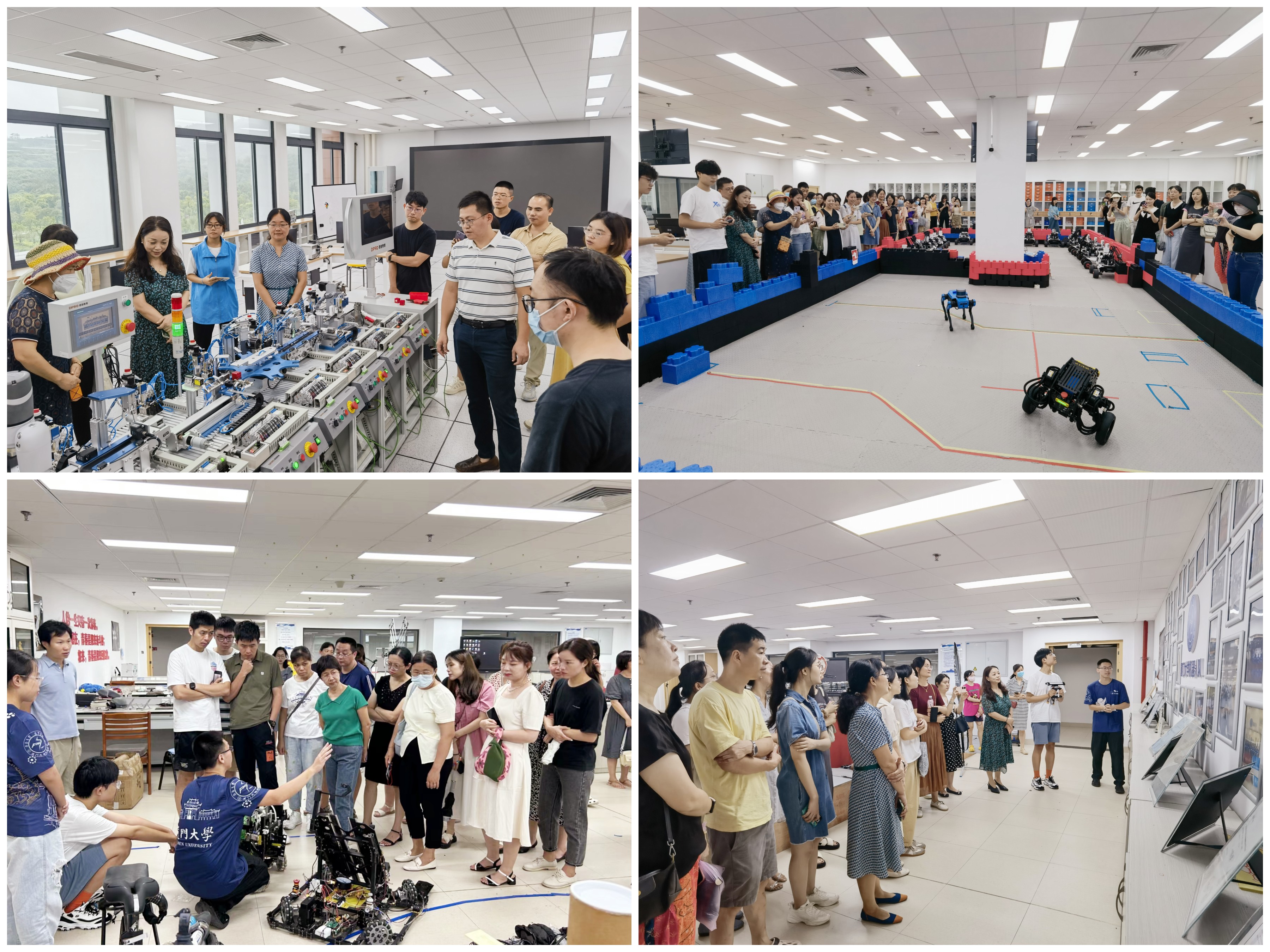 接着,来访教师来到新工科研发大楼,参观了电工学实验室、工业控制技术实验室、机器人实验室、M07RCS创客空间和机械制造实训平台。实验室老师为大家介绍了实验室建设和管理的先进理念,讲解示范了工业智能制造生产线的工作流程。机器人队志愿者介绍了机器人队的发展史和已取得成绩,并就双足机器人、四足机器人做现场展示。