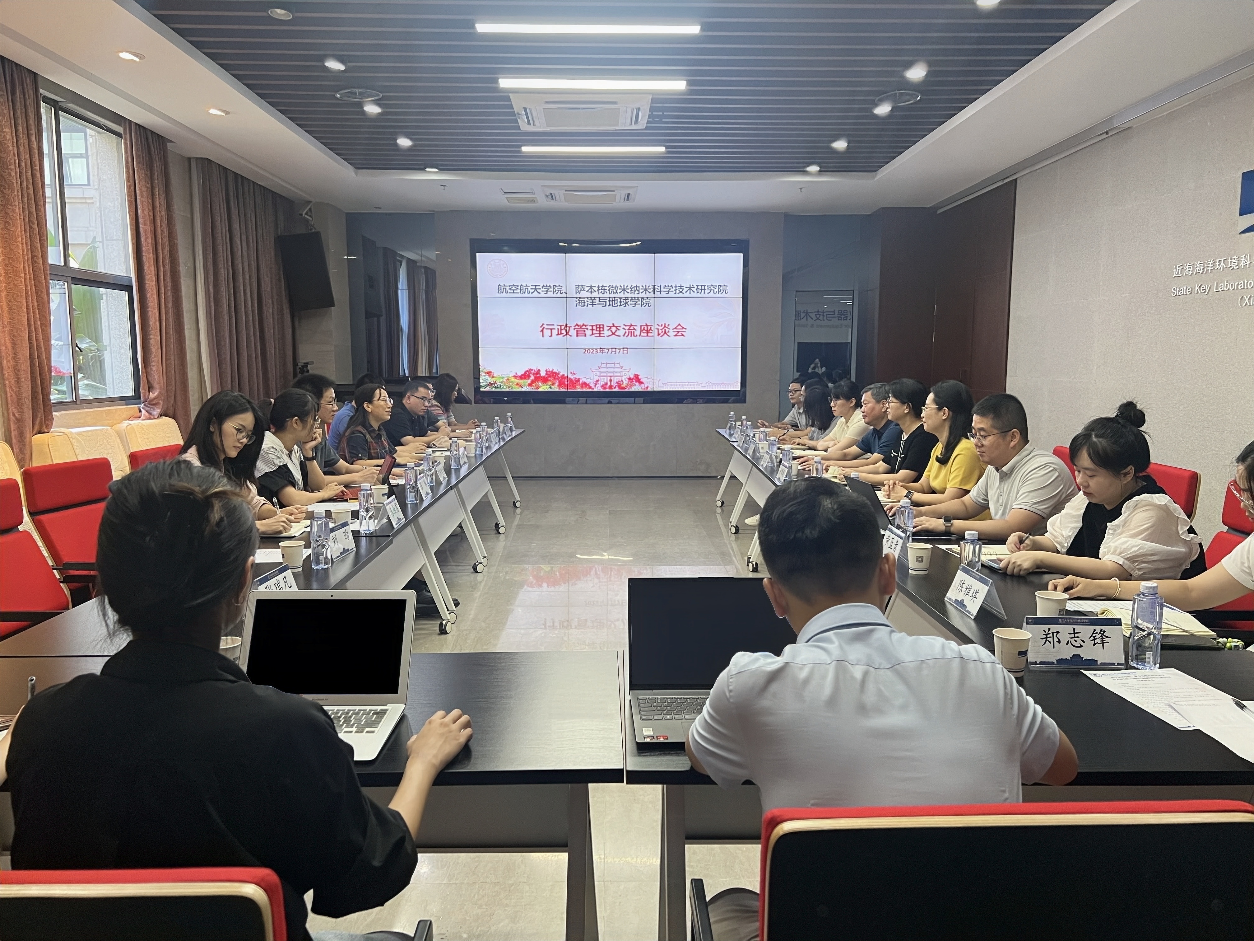 为深入学习贯彻习近平新时代中国特色社会主义思想,不断提升学院、研究院综合服务保障能力,为学院、研究院高质量发展提供高效优质支撑保障,7月7日上午,航空航天学院党委书记廖志丹率航空航天学院、萨本栋微米纳米科学技术研究院行政支撑团队代表赴海洋与地球学院开展行政管理工作经验交流。海洋与地球学院党委书记吴立武、党委副书记唐腾凤及行政支撑团队代表出席会议。