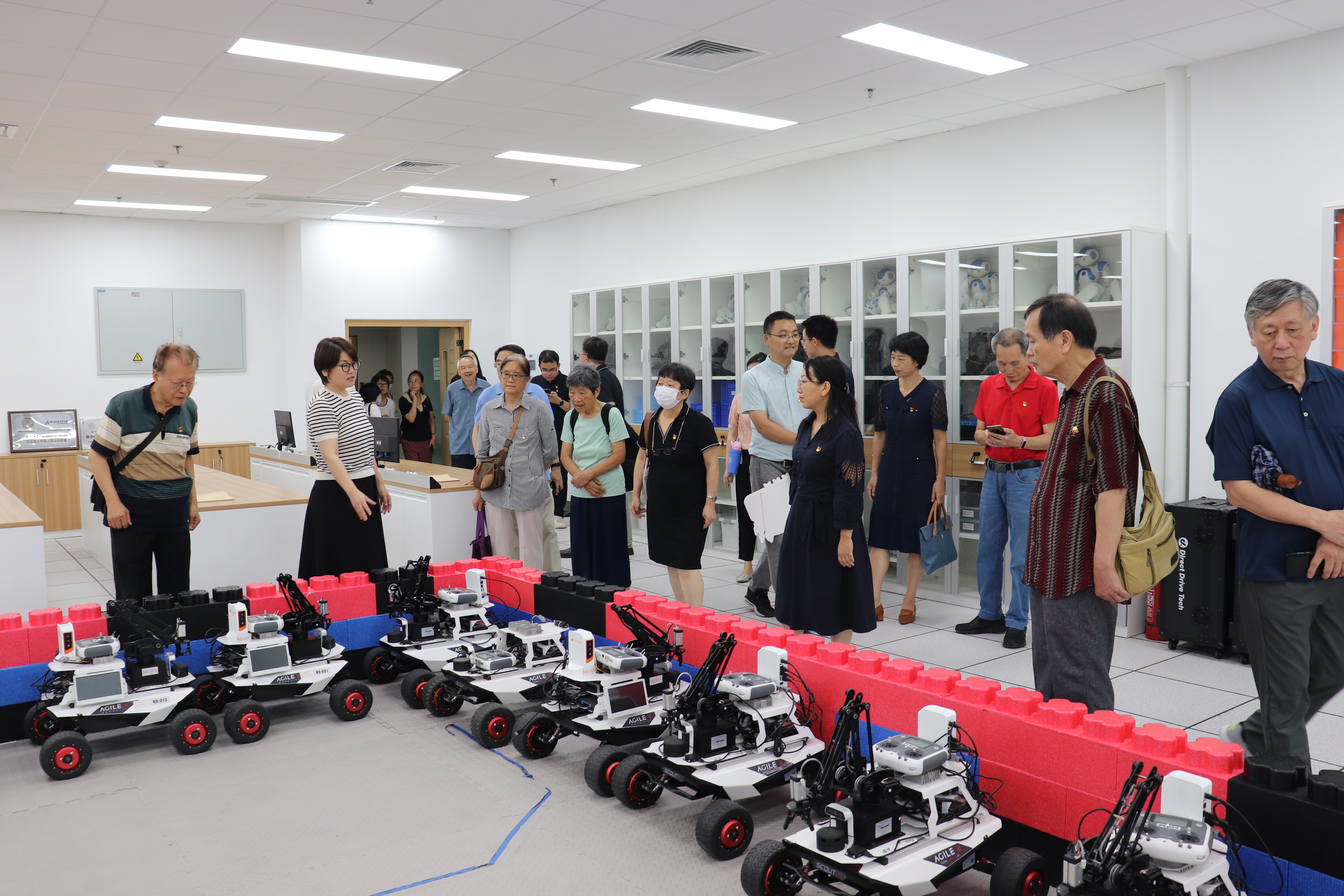 随后,退休教工党员一行驱车来到位于校区北部的新工科研发大楼。新工科研发大楼主要为航空航天学院、全校工科电子科研、新工科现代制造科研及创新用房,是我校改善工科“硬环境”、提升科研“软实力”的重要举措。老同志首先参观了金工实习车间,精装先进的教学加工设备、立柱上“大国重器”的配图等,都表明了这里是厦门大学培养“大国工匠”的第一站。紧接着,一行人来到了智能教学实验室。近期刚刚购进的智能机器人车、仿真机器人以及模拟自动化流水生产线装置等,无不透露着航空航天学院在“寓教于乐”“知行结合”方面做出的努力,大家在详细了解相关情况后对此纷纷点赞。