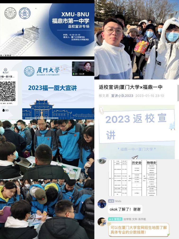 福鼎一中宣传队选择与北京师范大学的校友合作一同完成宣讲,队员们前期通过建立公众号发布推送、设计海报进行宣传。宣讲时不仅详细展现了立体厦大,也介绍了招生政策与各专业的分数线等重要信息,最后还贴心地向学弟学妹们分享了宝贵的学习备考经验。