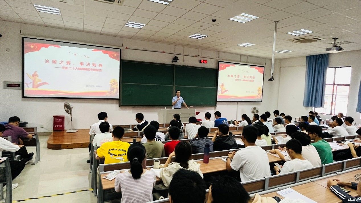 为深入贯彻落实《教育部关于加强新时代高校“形势与政策”课建设的若干意见》,更好地发挥“形势与政策”课程在立德树人方面的重要作用,11月21日下午,校党委常委、副校长邱伟杰来到厦门大学翔安校区学武楼A401教室为航空航天学院2022级工科试验班学生讲授了以“治国之要,奉法则强——深入学习贯彻习近平法治思想”为主题的“形势与政策”课。
