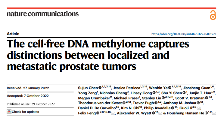 近日,厦门大学航空航天学院自动化系、健康医疗大数据国家研究院吉国力教授团队和加拿大 Princess Margaret Cancer Centre、University of Toronto何厚胜教授团队等在期刊Nature Communications上发表题为“The cell-free DNA methylome captures distinctions between localized and metastatic prostate tumors”的合作研究论文,揭示了循环游离DNA甲基化作为前列腺癌生物标志物的潜力。