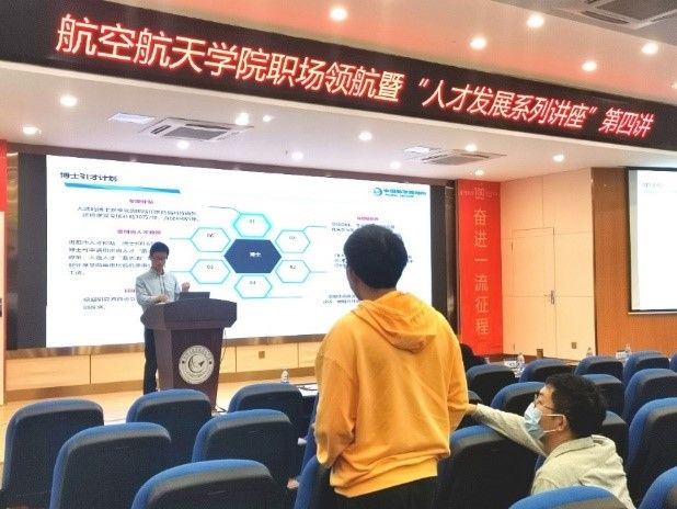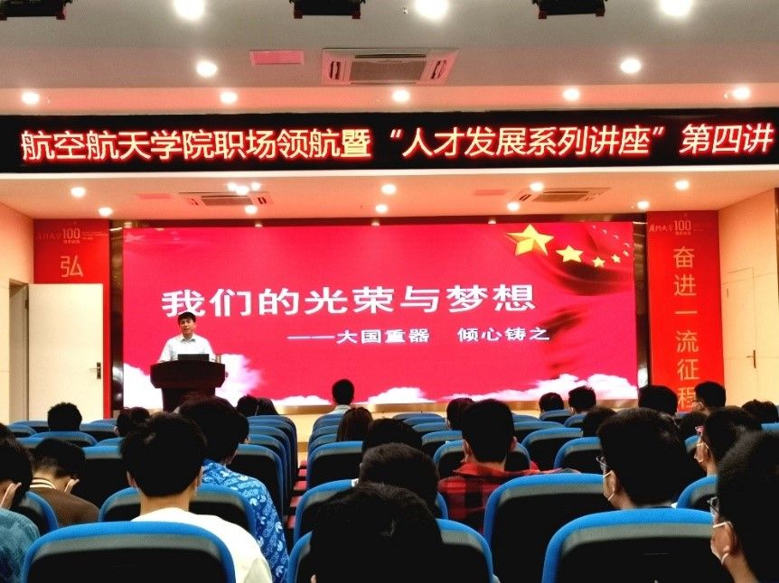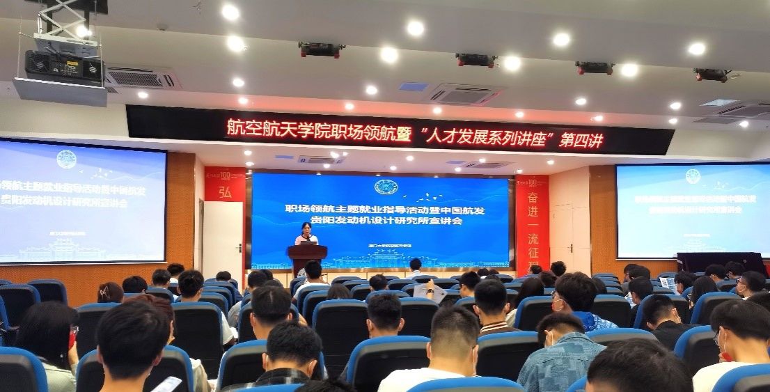 为国家培养和输送高素质、创造性的空天领域高层次人才,是航空航天学院近年人才培养和职业指导的重点工作。为深入学习贯彻党的二十大精神,航空航天学院于2022年10月27日举办职场领航暨“人才发展系列讲座”第四讲。中国航发贵阳发动机设计研究所党委副书记王新明作主题为“大国重器、倾心铸之我们的光荣与梦想”的宣讲,抒时代感悟、展未来图景。学院党委副书记林蔚、副院长周伟、团委副书记倪建超、辅导员刘群以及百余名师生参加本次活动。