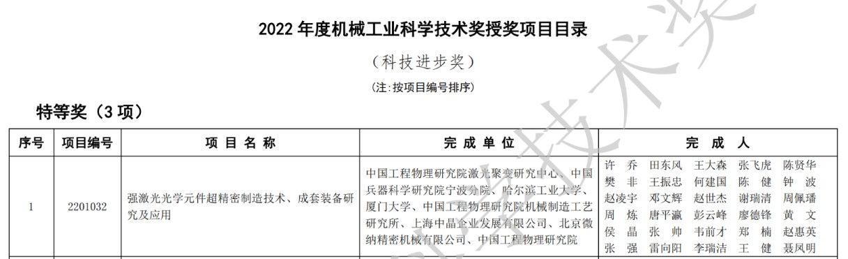 2022年10月20日,中国机械工业联合会印发关于表彰2022年度“机械工业科学技术奖”奖励项目的通报。我院课题组参研项目“强激光光学元件超精密制造技术、成套装备研究及应用”,荣获“科技进步奖”特等奖。