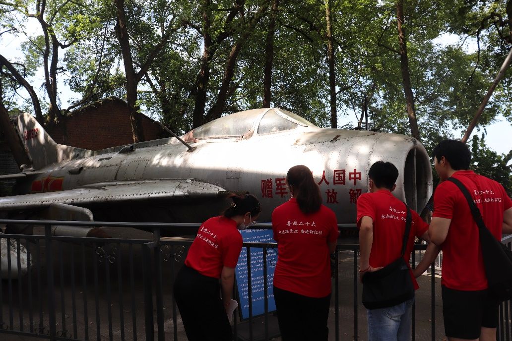 随后,实践队参观停放于陈列馆前的一架双发超音速喷气式战斗机歼-6。它是20世纪60年代中国沈阳飞机制造工业公司研制的主要用于国土防空和夺取前线局部制空权、也可执行一定的对地攻击任务的战斗机。实践队成员对飞机基本构架和其飞行历史进行了解,并就战斗机发展历史进行交流,进一步认识到科技发展的重要性,坚定了作为航院学子,克服艰难险阻,开发核心技术,在“领空绘出绚烂的红色”的决心。