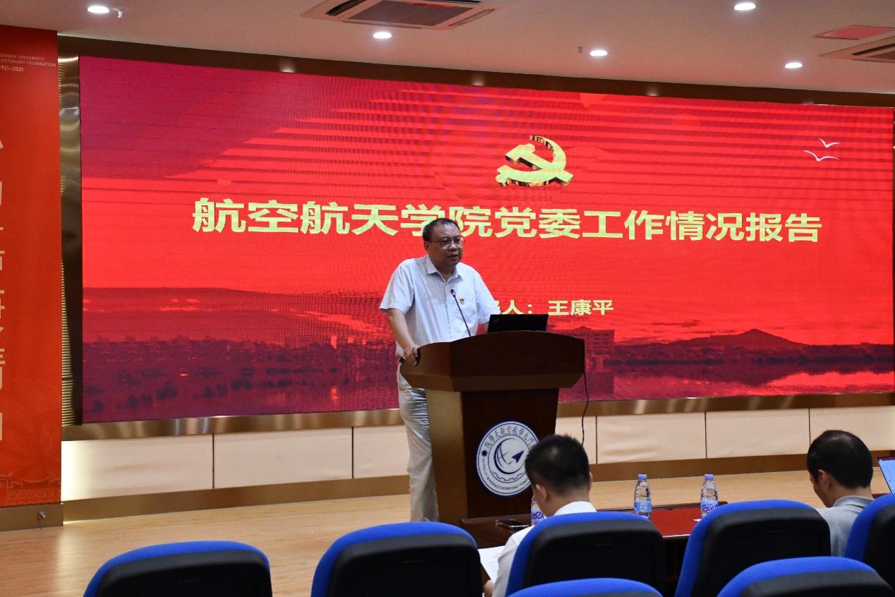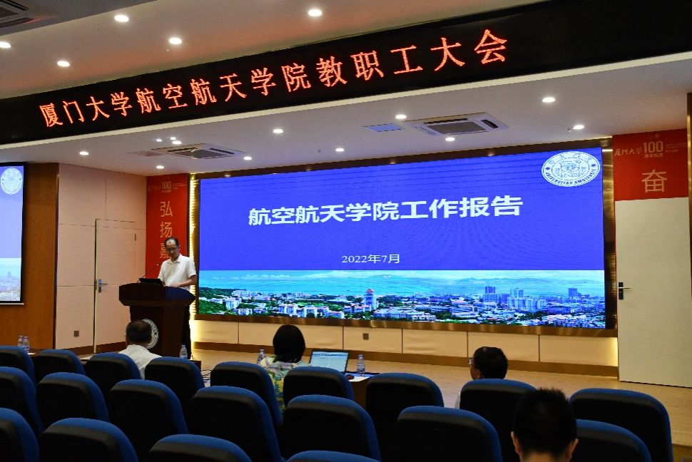 2022年7月25日上午,航空航天学院2022上半年度教职工大会在航空航天大楼547报告厅召开。学院党委书记王康平,常务副院长尤延铖,副院长卿新林、周伟、王颖及全院教职工参加会议。会议由党委副书记王寒主持。