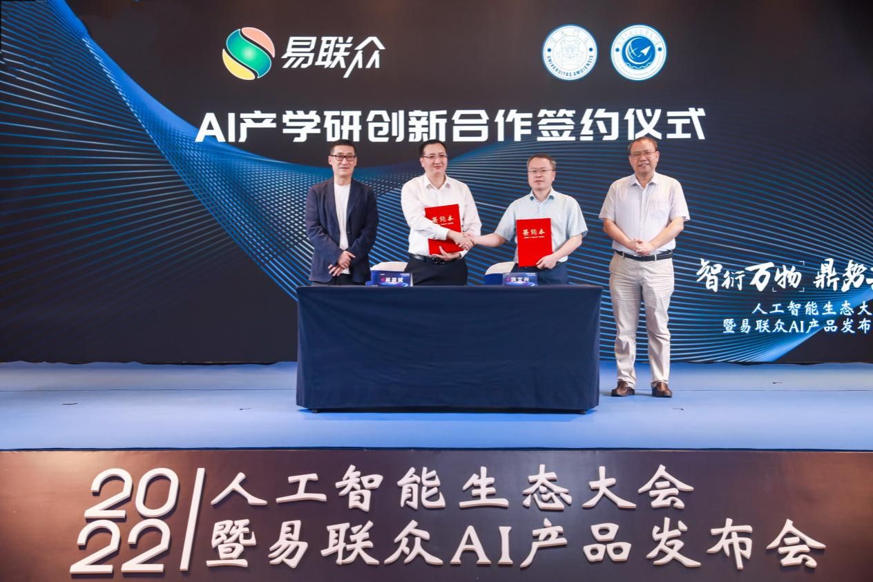 会上,厦门大学航空航天学院与易联众集团举行了AI产学研创新合作签约仪式。在王康平、张曦的见证下,洪文兴与吴梁斌代表双方共同签订《AI产学研创新合作》。未来,AI产学研创新合作平台将聚集更多的高校参与平台的研发工作,凝聚高层次人才力量,助力校企合作共赢。
