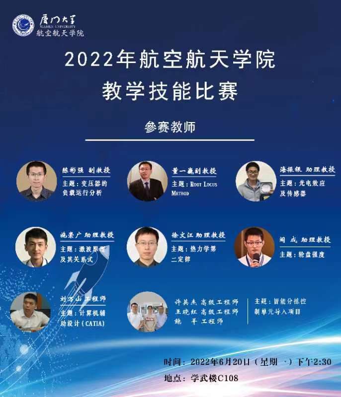 为切实提升青年教师的教学技能,有效激发广大教师的教学工作热情,在院工会和教学培养支撑中心的共同组织下,航空航天学院2022年度青年教师教学技能比赛于6月20日下午在翔安校区学武楼C108教室成功举办,共计8位青年教师参加了青教理论、英语教学和实验教学三个组别的比赛。院工会主席林冬云主持比赛,飞行器系副主任王晓光、动力工程系副主任许伟伟、机电工程系副主任马盛林、仪器与电气系副主任郑高峰、自动化系副主任刘云龙以及工程技术中心副主任李继芳担任比赛评委。