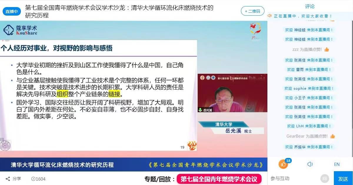 会议分为学术沙龙、大会特邀报告、专题研讨会等环节。中国工程院院士、清华大学教授岳光溪在学术沙龙中就“清华大学循环流化床燃烧技术的研究历程”为主题向大家分享了自己的科研经历,畅谈科研生涯中的感悟和体会。岳光溪院士的分享反响热烈,激发了广大青年的科研热情和科研决心。