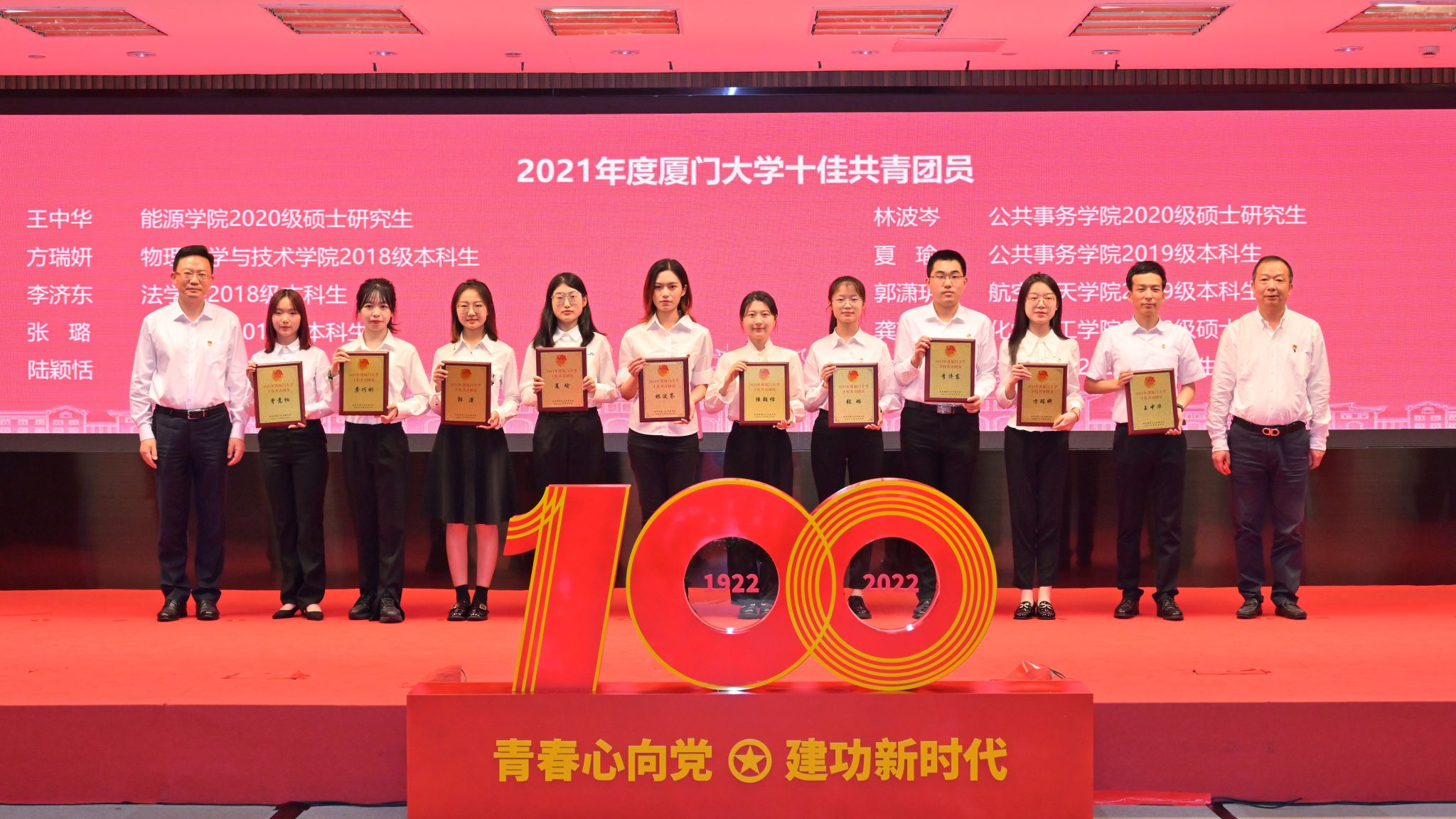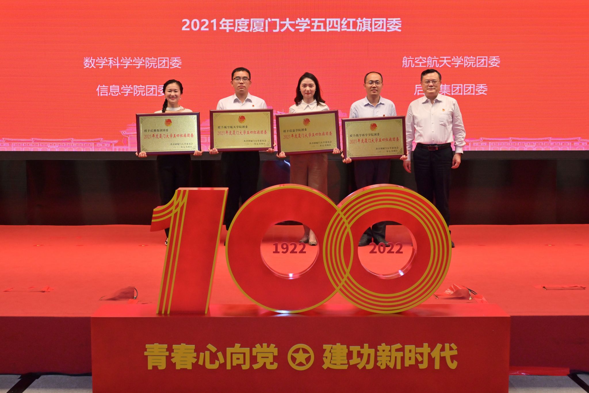 2022年5月10日下午,厦门大学学习习近平总书记重要讲话精神座谈会暨2021年度“两优两红”表彰大会在科学艺术中心多功能厅举行。大会总结了2021年度学校共青团工作情况,对一年来我校共青团工作表现突出的集体与个人进行了表彰。大会深入学习贯彻习近平总书记重要讲话精神,认真领会深刻内涵和实践要求,引领广大青年师生坚定不移听党话、跟党走,齐心协力向着建设中国特色世界一流大学的目标奋勇前进。