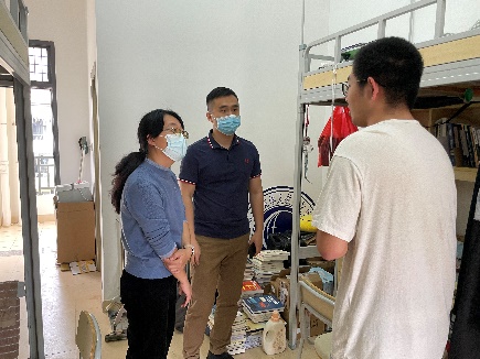 面对当前严峻复杂的疫情形势,学院学工组第一时间召开工作会,院党委副书记张晴、林蔚就疫情防控工作进行工作安排。林蔚带队走访社区宿舍,宣传疫情防控政策,了解学生思想动态,关心解决学生困难,增强战胜疫情信心。学院启动网格化全覆盖管理,把防控疫情作为当前首要任务,全面动员、快速行动。迅速启动“博学先锋”和“聚萤映雪”党支部党员突击队,联合博学、映雪“一站式”社区党支部和楼层舍长共同组成网格化管理体系的基础,在宿舍楼栋开展疫情防控政策宣传、垃圾分类督导、监督佩戴口罩及应急处理等工作。网格化管理体系实现了学院疫情防控工作责任到岗、到人的精准管控,从严落实疫情防控措施,切实保障全体师生安全。