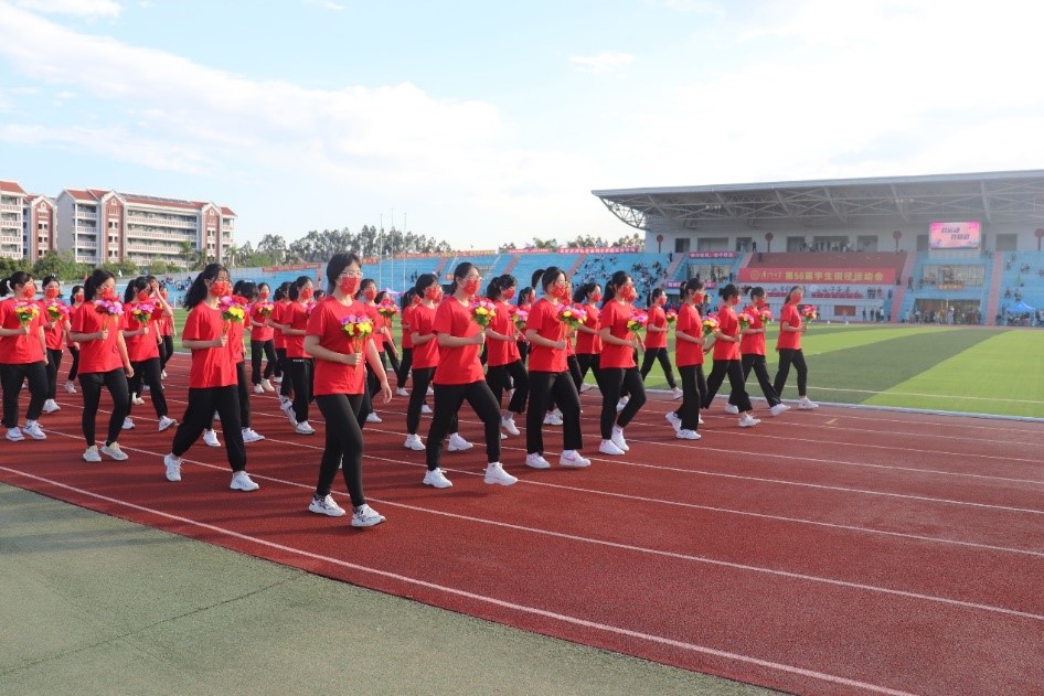 沐浴着灿烂的霞光,迎着初升的朝阳,各学院方阵已经准备好以最饱满的姿态,最昂扬的斗志展现厦大学子的风采。八点整,运动会入场式正式开始,各队列的同学步伐整齐,精神抖擞,按序入场。走在最前面的是国旗方阵、彩旗方阵和花束方阵。由校团委12位同学组成的国旗方阵象征着中国各族人民大团结,表现当代大学说把祖国放在第一位的爱国情怀;由60名大一新生组成的彩旗队象征着莘莘学子展翅飞翔,拥抱青春的阳光;由56名英姿飒爽的女运动员们组成的花束队象征着祖国的明天繁荣昌盛,祖国的“花朵”们朝气蓬勃,奔向辉煌的明天。
