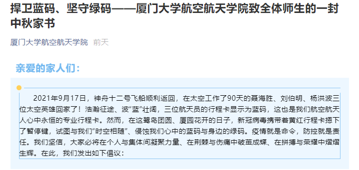 开学伊始,福建省多地相继发生新冠疫情,厦门市疫情防控形势复杂严峻,航空航天学院严格按照上级部署开展疫情防控工作。2021年中秋佳节到来之际,正值全院师生众志成城抗击疫情的关键时期,每一位师生的身体健康和学习工作生活情况都牵动着学院的心。学院党委印发《关于进一步发挥航空航天学院基层党组织战斗堡垒和党员先锋模范作用开展2021年“防疫领航”工作方案》的通知,发布致各党支部、全体党员的倡议信和致全体师生的一封中秋家书,实施疫情防控、党建思政和事业发展保障工作,并紧扣疫情形势和专业特色、饱含温情地勉励和倡导全院师生敢于战胜一切艰难险阻,防疫领航、行稳致远。