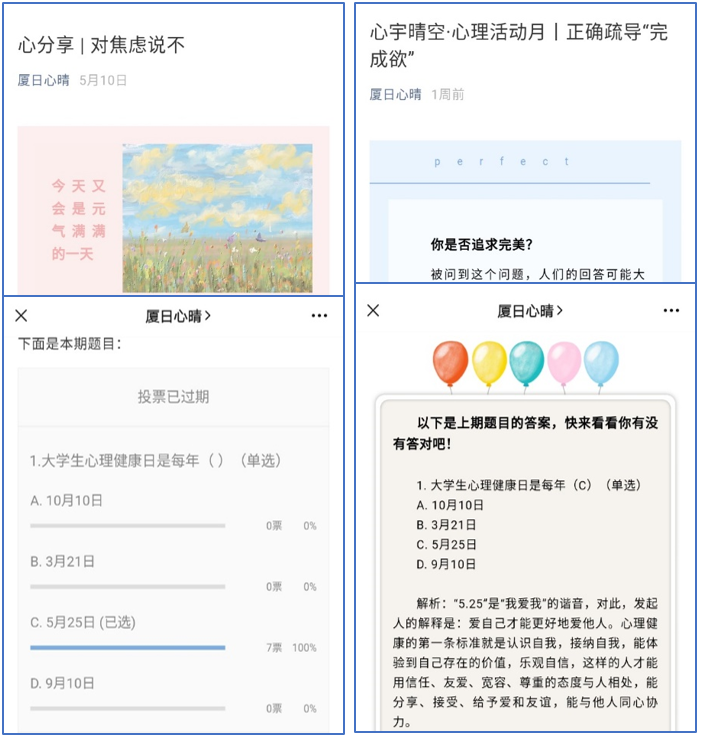学院发挥网络平台优势,依托“厦日心晴”、辅导员孟旭“絮语工作室”微信公众号开展线上心理教育,推出“心宇晴空”主题系列推文。以大学生常见的消极情绪为主题,解析其中蕴藏的心理知识,推送内容涉及焦虑情绪、完成欲、遗忘曲线等。每周定时推送心理健康知识,增强学子对心理健康的认知。