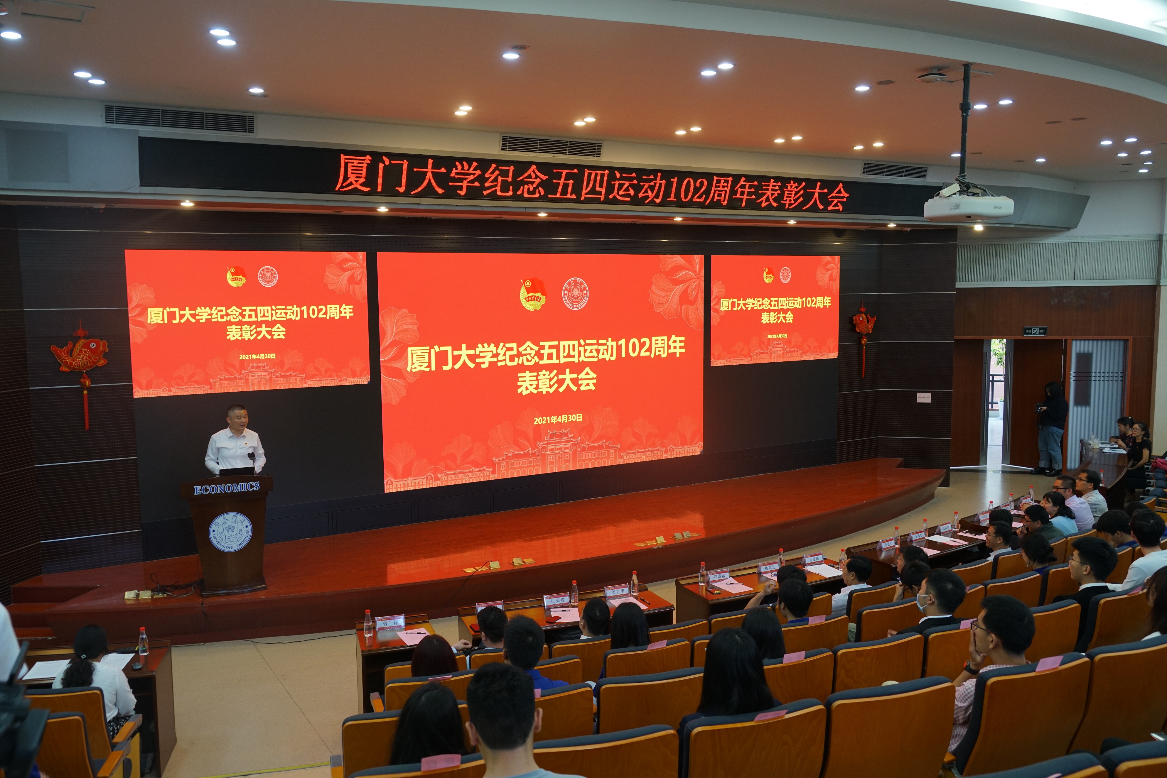 2021年4月30日下午,厦门大学纪念五四运动102周年表彰大会暨“青春心向党 奋进新百年”主题团日活动在经济学院N402报告厅举行。校党委副书记徐进功出席大会并讲话,大会总结了2020年度学校共青团工作情况,对一年来我校共青团工作表现突出的集体与个人进行了表彰,公布了厦门大学首批“囊萤星火青年讲师团”成员名单,并开讲“青春心向党 奋进新百年”主题团课。