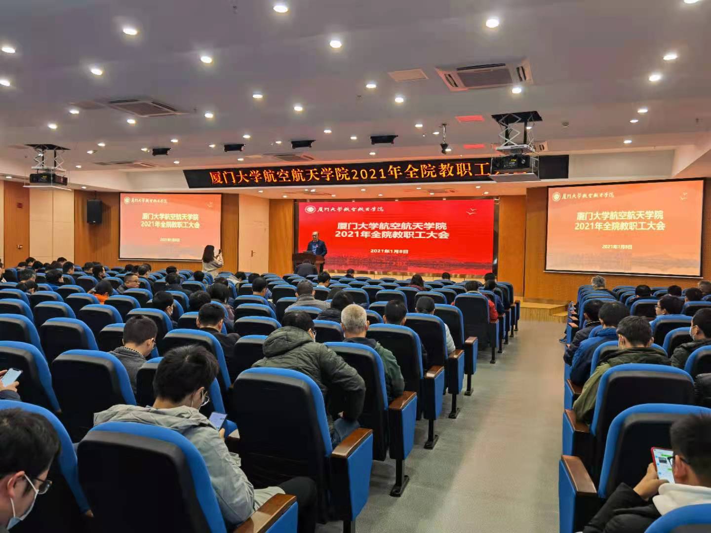 2021年1月8日上午,航空航天学院在院楼报告厅召开2021年全院教职工大会,会议总结梳理了过去一年的工作和成绩,对未来发展方向做出规划部署。院党委书记王康平、常务副院长尤延铖、副院长兰维瑶、院党委副书记林蔚出席会议,全院教职员工参加会议,会议由院党委副书记张晴主持。