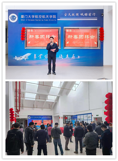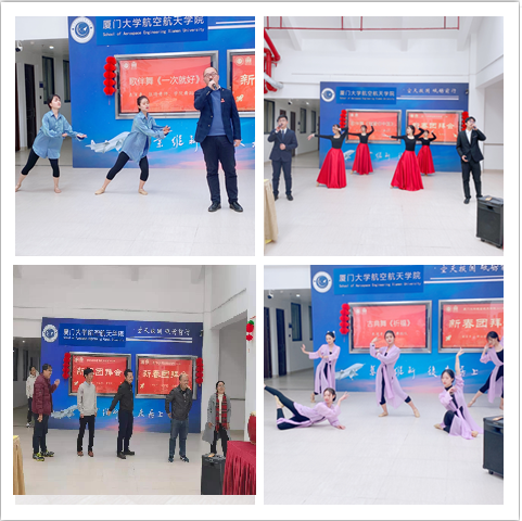 会后,学院在五楼大厅向全院教职工进行了新春团拜,团拜会由院科研产业支撑中心副主任、仪器与电气系副教授曾念寅主持。院党委副书记张晴,飞行器系、动力工程系秘书章艺,苗佳、周逸轩、陶艺萌、张梦迪、袁菡等学院学生艺术团成员进行了精彩的歌舞器乐表演,期间还进行了互动游戏,现场气氛喜庆热烈。