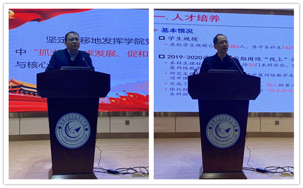 王康平从干部工作、党建工作、文化宣传、理论学习、学生思政、教师思政、群团工作以及安全保密工作等方面对2020年学院党委工作做了详细阐述。他指出,过去一年,学院胜利召开第一次党代会,选举第一届委员会。学院党委以党建工作为抓手,在组织架构、规章制度等方面进行了创新完善,发布执行《党支部标准化建设项目清单及考核标准》,完善健全意识形态工作机制,接受校党委第四轮巡察工作。创设行政支撑中心,分人才思政、教学培养、科研产业和综合四个办公室开展工作,并选任4名中青年教师挂职,有效提升了综合治理水平。通过丰富各类党建活动、扎实开展文化宣传、深化理论学习、开展课程思政等方式提升师生政治理论水平,营造良好学院氛围。学院在各方面取得了骄人成绩,其中以全校总分第1名获评2020年度学生工作先进单位(连续第三年获评),并获日常思想政治教育(连续第二年获评)、学生心理健康教育、学生学业学术科技创新创业三项工作“特色单位”称号(全校最多),创造历史最好成绩。接下来学院党委要进一步凝心聚力,按照学校“双一流”建设及“十四五”规划目标任务,推动学院大团队建设,助力学院学科发展。