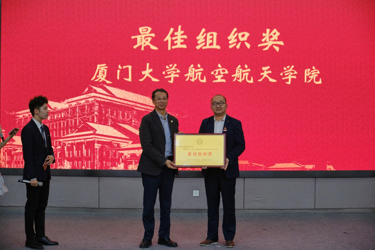 校党委副书记赖虹凯老师向我院颁发最佳组织奖,院党委副书记张晴代表学院上台领奖。