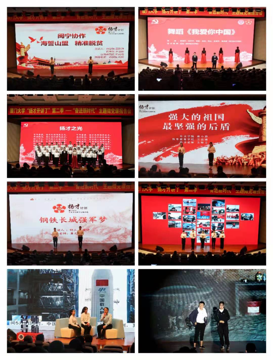 由台湾研究院和药学院的两位“小扬才”带来了微党课《闽宁协作,海誓山盟·精准脱贫》,讲述了一代又一代厦大人参与闽宁对口扶贫协作,在隆德的土地上走出一条坚定的、科学扶贫道路的动人故事;由嘉庚学院带来的微党课《我和我的家乡》通过一段精彩的情景剧重现了厦大人通过电商事业推动家乡建设的奋斗之路;外文学院和海外教育学院的“小扬才”在微党课《强大的祖国,最坚强的后盾》中细数利比亚撤侨等事迹,展现了祖国在保护人民和国际事务中的大国担当,悠扬的配乐中诗朗诵《如果你问我,关于我的祖国》震撼了全场。中场节目,由航空航天学院同学们带来的舞蹈《我爱你中国》点燃了全场观众的爱国热情。