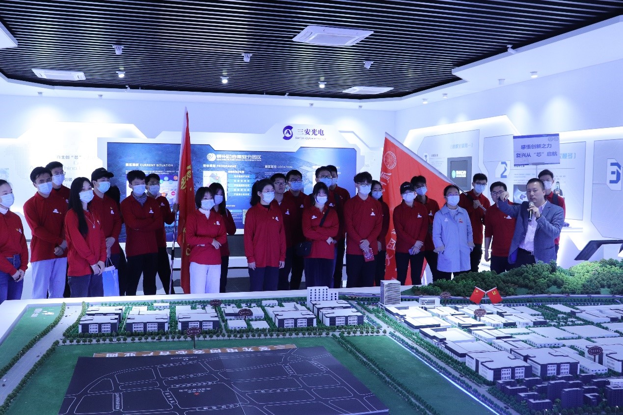 改革开放史是一部创新史,“四史”学习教育要讲好创新故事,让青年学生深刻体会创新的力量。上午9时许,调研实践队来到南安市“福建芯谷南安园区”交流学习,在此感悟创新的力量。在园区海峡科技生态区的填海滩涂,学员们了解园区的发展和规划,并眺望对岸的金门岛,共同对话过去,展望未来。随后,在园区工作人员的引导下,实践队员们参观了泉州半导体高新技术产业园区展厅,深入了解泉州芯谷的发展方向以及研制的诸多高科技产品。