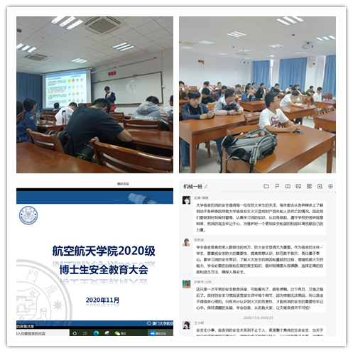 为增强和提高同学们的安全防范意识及能力,11月1日至8日,学院本、硕、博各班级围绕“国家安全、财产安全、消防安全、实验安全”四个主题开展安全教育主题班会。各班班长、安全委员采用线上、线下班会形式,通过贴近生活的事例,引导同学围绕四种安全问题的应对措施以及预防方案展开讨论和交流。2019级本科机械2班江昊烨表示:“希望同学们认真执行有关规定,自觉遵守校纪校规。当前随着网络、电信技术的日益飞速发展,一些不法分子借助网络、电信等媒介实施各种诈骗活动,打击和防范诈骗已成为全社会的共同话题。一方面,警方要重拳出击,打击不法活动,另一方面,作为大学生,我们要努力学习防范诈骗的基本知识,提高防范诈骗的能力,遇到实际问题,忌盲目、多思考,不要被某些假象所迷惑。”同学们在主题班会的交流中知识互补,完成了对国家安全知识、个人财产安全知识、实验室消防安全知识、疫情防控知识等方面的学习和自我思考过程。