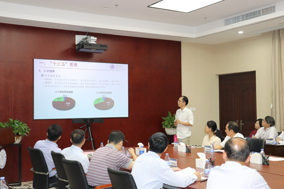 航空航天学院常务副院长尤延铖从学院规模、教育质量、人才培养、科学研究、队伍建设等方面介绍学院当前情况,简明扼要指出学院当前的优势与缺点,并通过多个数据具体分析可取之处与不足。之后以“十三五”规划取得的成果为例,结合学院现状,指出应瞄准国家发展战略与重大需求,制定“十四五”规划,计划于多个领域取得长足进步,同时提出强化组织领导与专项经费支持等建议。尤延铖分析机遇与挑战,针对工科第四轮学科评估,在各个学科方向确定具体指标,指出学院当前所面临的硬件设施等问题,表示要组织好、协调好各方面资源,推动学院努力向前发展。