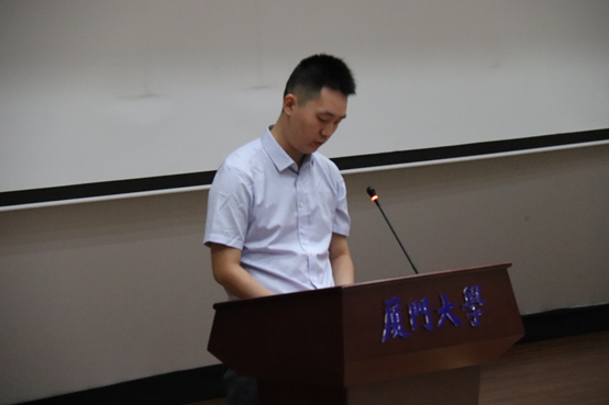 新生代表,2020级本科七班钟易晟发言。首先,钟易晟代表全体新生向默默付出的老师、家长,尽职尽责的学长学姐和工作人员表示感谢。随后,钟易晟讲到,第一次来到厦园,最吸引他的不是道路两旁盛开的凤凰花,不是中西结合、磅礴大气的建南建筑群,而是弥漫在厦园中的浓厚科学与文艺气息,是厦大蕴含的情怀和精神。“一个人只有把人生理想融入到国家和民族的事业中,才能最终成就一番事业”,在钟易晟看来,想要实现中国梦,就要脚踏实地,勤奋学习知识并勤于实践,不断把理论和实践相结合,踏踏实实,才能为明天的厚积薄发打下基础。