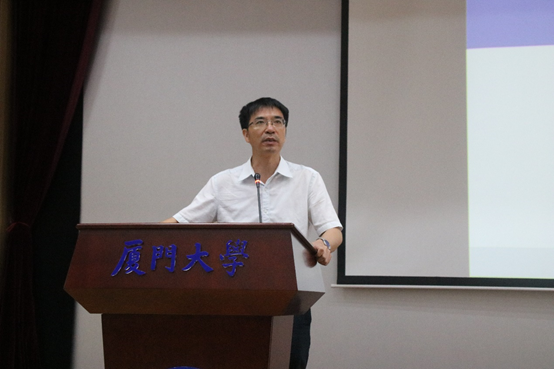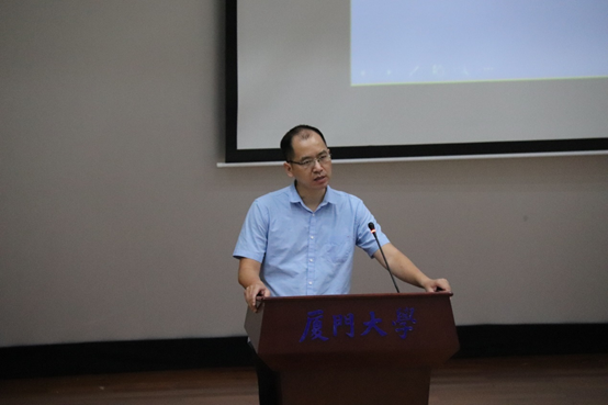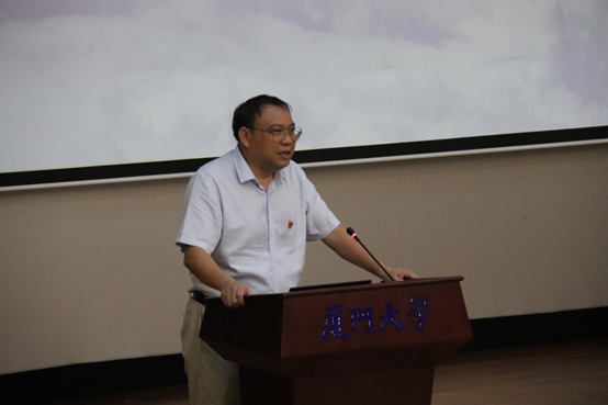 紧接着,厦门大学经济学院张兴祥教授为新生解读厦门大学“四种精神”——陈嘉庚先生的爱国精神,罗扬才烈士的革命精神,抗战时期厦大内迁长汀艰苦办学的自强精神,以王亚南校长、陈景润教授为代表的科学精神。