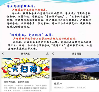 学院学工组向全院学生发布了爱国卫生倡议,并召开各年级教育培训大会,倡导全体同学认真培养卫生健康意识,积极参与爱国卫生运动。同时,在征求部分学生代表意见的基础上,制定了学生社区公约,号召同学们按照公约要求自己,自觉维护社区卫生与秩序,将安全隐患用公约隔离,守护宿舍幸福生活,营造“安全意识放心上、宿舍公约贴墙上、疫情防控有规范”的社区氛围,让社区更舒适、更卫生、更文明。