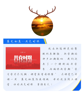 抗击新冠肺炎的警报仍未解除,新学期的钟声如期敲响。特别的开学季,特殊的上课形式。为响应学院号召、确保新学期“学生学习不延期、课堂质量有保障”,晨光初厦防疫特辑活动于2月24日正式上线,以每日签到打卡为主要活动形式,旨在帮助同学适应线上课堂,保证学习质量。活动设置了多种打卡方式,更撰写了涉及疫情多方面的推送,14天不重复的打卡方式及推送内容保证同学们的积极性,鼓励同学参与到早起打卡的活动中来,关于疫情的推送起到了不小的宣传作用,受到同学们的一致好评。