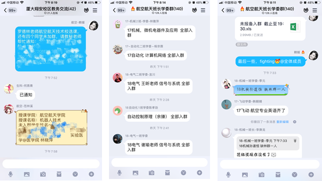 2月11日,除32门在第4周以后开课的本科实验、实训课外,其余145门本科课程全部建立课程群,研究生开展网络教学及学习研讨课程32门。全院教师、教学秘书、辅导员通力合作,组织学生入群,并进行地毯式排查,确保一个学生不掉队,至2月16日,已完成所有课程学生100%入群。