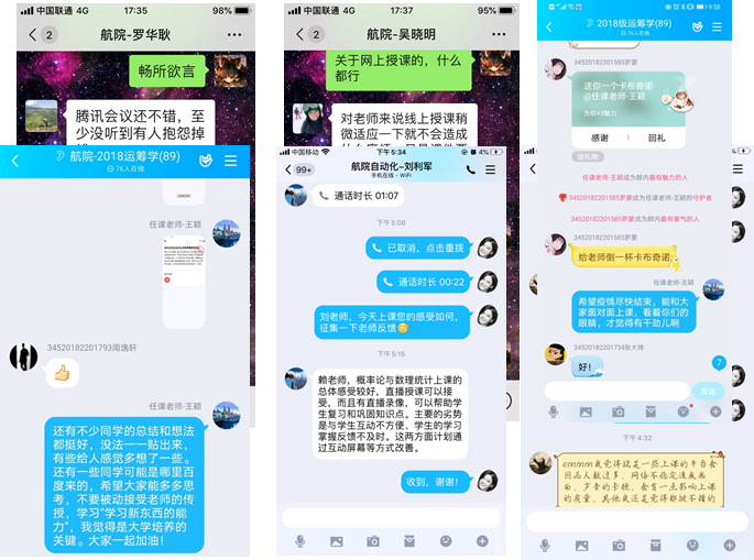 2017级本科生李玉梅家住青海一个偏远小镇,家里没有办理宽带,为及时参与网络课程学习,每天带着笔记本电脑到大伯家,路上都会回忆起从食堂吃完早饭去学武楼上课的场景,十分想念校园生活。2019级本科生刘思嘉表示非常开心线上教学活动可以正常开展。老师们能够利用各种平台、方法,尽心尽责授课、答疑,同学们在线上积极讨论,学习很有热情,感谢老师们的付出。2018级班委黄宇宸认为这种授课形式特别、新颖,在特殊时期以一种特别的方式学习,值得记忆!