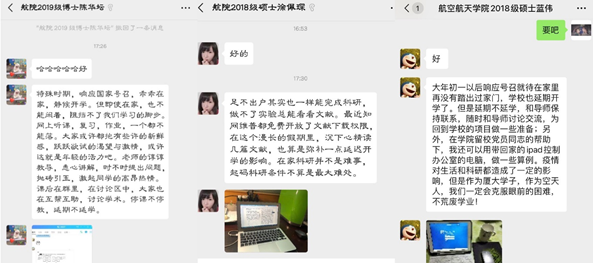 对于线上教学和老师们的付出,同学们看在眼里、感动于心。2019级博士生陈华坛说到,在特殊时期,响应国家号召不外出,但依旧会通过网上听课,复习和讨论。他认为老师线上授课非常认真耐心,提出的问题能激起同学的热情,在课群和讨论区中,大家也能针对课程和学术进行热烈讨论,互帮互助。2018级硕士生徐佩琛提到,足不出户也一样能完成科研,做不了实验也能看看文献。知网和维普都免费开放文献下载权限,为同学们在家科研提供了理论支持。院研究生会主席蓝伟在家期间也一直和导师保持联系,随时讨论交流,为科研项目做前期准备,他特别提到在学院留校党员的帮助下,他实现了利用ipad远程控制办公室电脑。