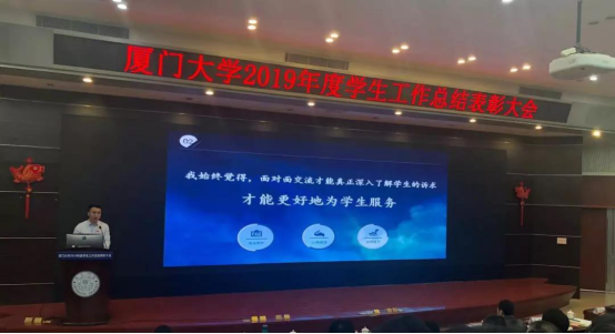厦门大学2019年度学生工作总结表彰大会于1月12日召开,校党委副书记赖虹凯出席会议并讲话。大会总结了我校2019年度学生工作的成绩和经验,并对 2019年度学生工作先进单位和个人进行了表彰。航空航天学院喜获“学生工作先进单位”(排名位列全校第三位、理工科学院第一位、翔安校区第一位),以及“日常思想政治教育”特色单位。辅导员贾君、王坤荣获2019年度“优秀辅导员”称号,王坤作为优秀辅导员代表在大会做了发言。