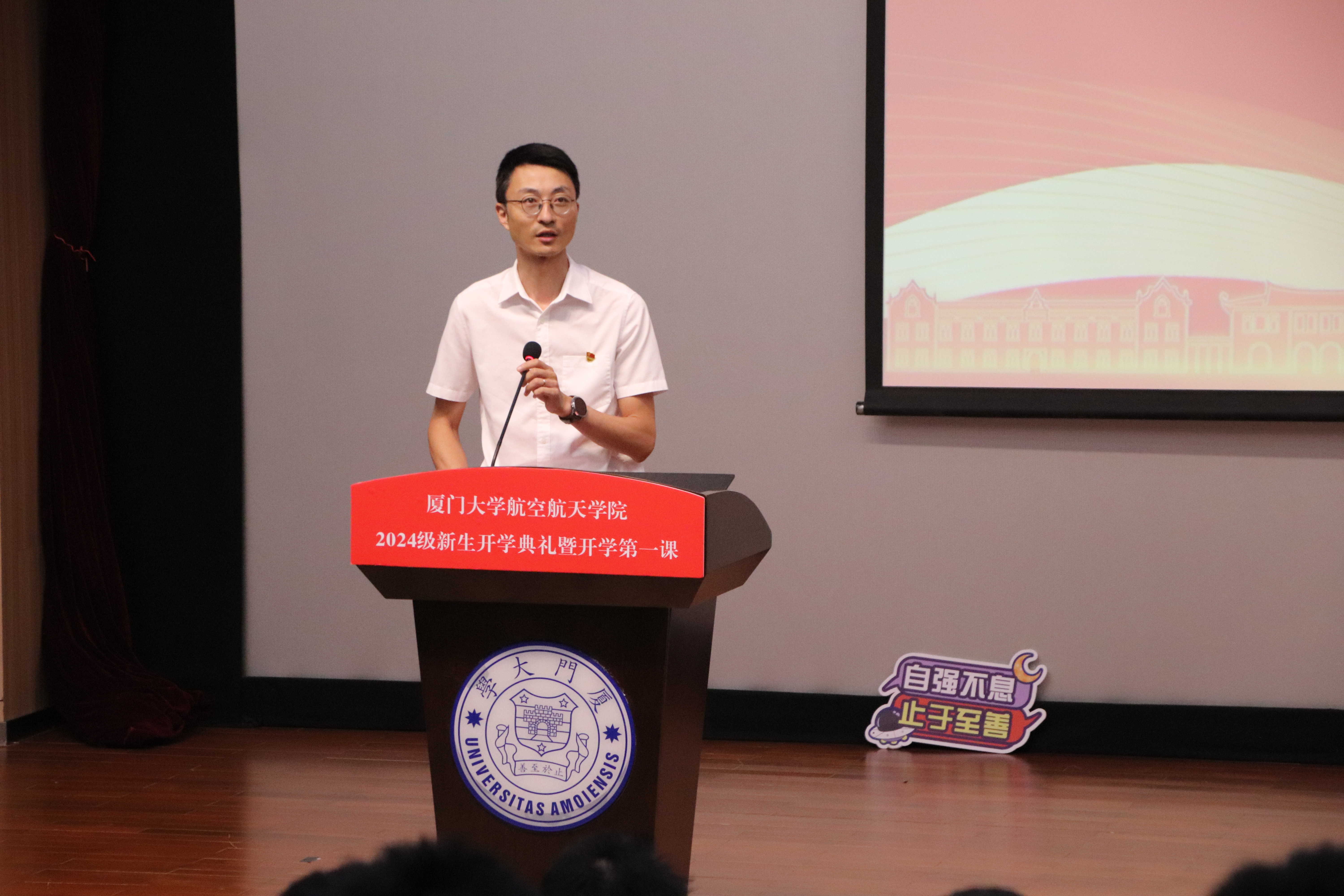 黄玥从组织架构、学科分布、平台条件、师资队伍、各中心发展、人才培养等方面向全体新生介绍学院概况,重点展示了学院代表性科研成果和各科研团队,激发新生学习科研热情。他指出,厦门大学航空教育历史悠久,学院紧跟国际前沿与国家战略,与航空航天各相关单位密切交流、深度合作。他鼓励新生充分利用校院提供的丰富学习资源,做好学涯规划,明确学习目标,共同为国家的空天事业努力奋斗。
