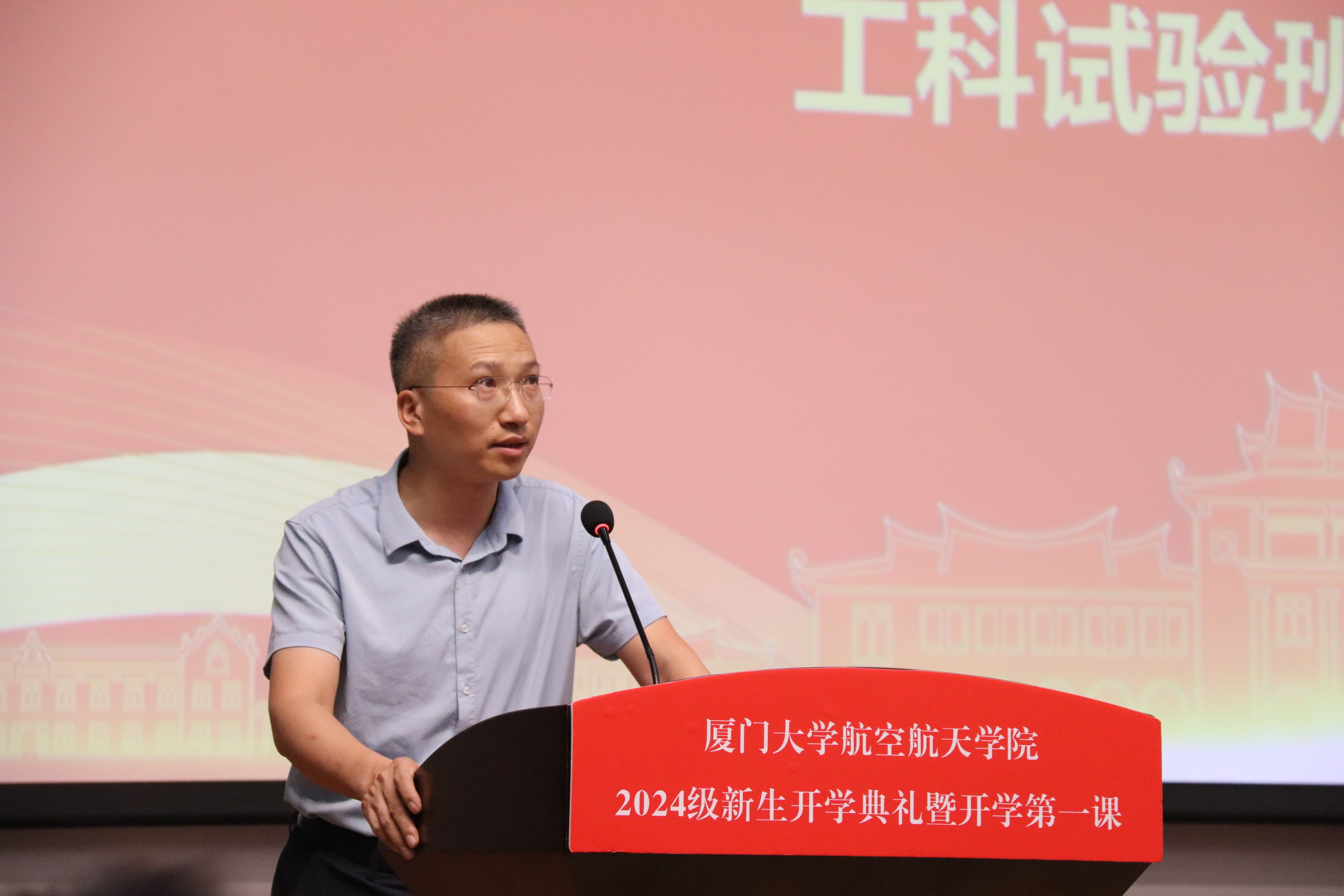 飞行器系主任、先进空天动力工程研究中心主任朱呈祥作为教师代表发言。他谈到,面对厦门大学广阔的校园与多元化的环境,新生们常面临着适应挑战。大家既要避免固守旧习、错失校园美好,也要警惕无度放纵、迷失方向。为此,他提出了大学学习的四个关键方面:专业知识、身心健康、处世之道、人生视野。此外,他还鼓励同学们珍惜大学时光,注重理论与实践相结合,积极参与科创活动,力争全面发展。