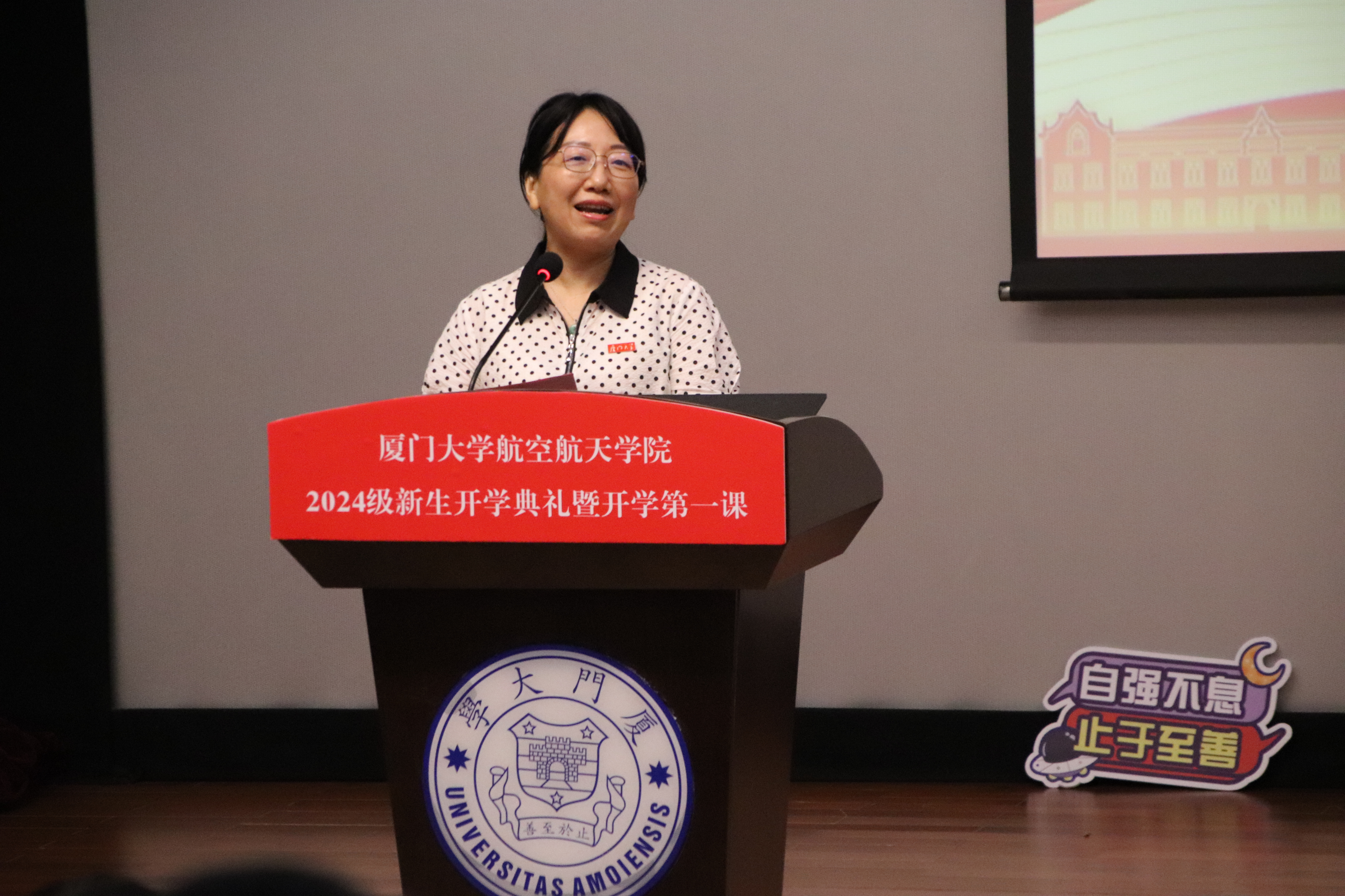 廖志丹代表全院师生对新生们的到来表示热烈欢迎,并简要介绍了院史院情,与同学们分享厦门大学“爱国、革命、自强、科学”的四种精神,希望大家校准成长的精神坐标,把握大好年华,厚积薄发,深耕伟大事业,收获属于自己的绚丽篇章。同时,她寄语全体2024级新生:一是要志存高远、自强不息,要有远大的理想和抱负,不断自我挑战,不断自我超越,在逆境中成长;二是要大道明德、止于至善,要求同学们在人生道路上追求光明磊落、正直善良的品格,勇敢面对自己的缺点,不断反思并进步;三是要善学善思、精益求精,从书本中获取知识,从实践中积累经验,培养独立思考的能力,从容应对复杂局面。
