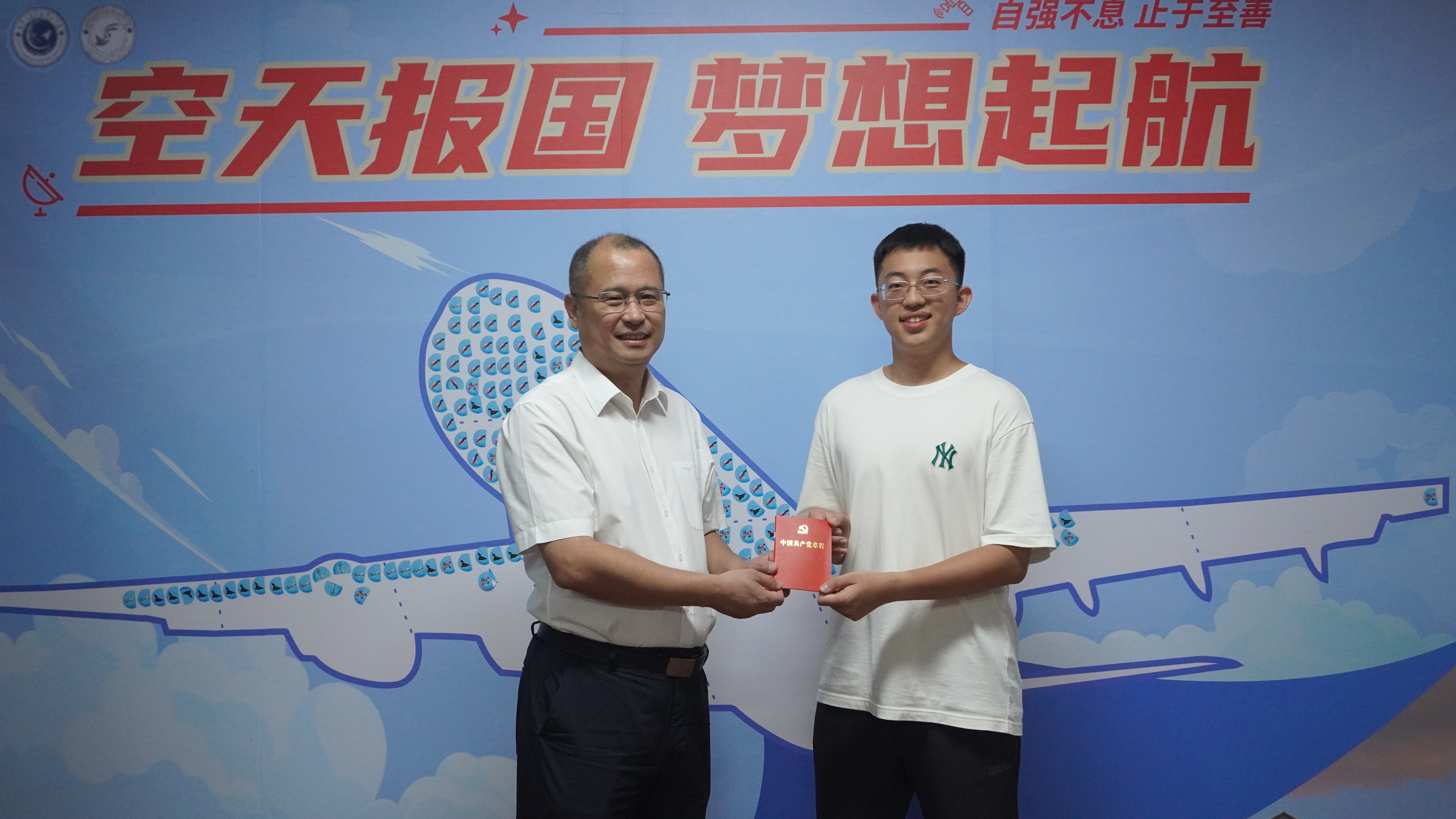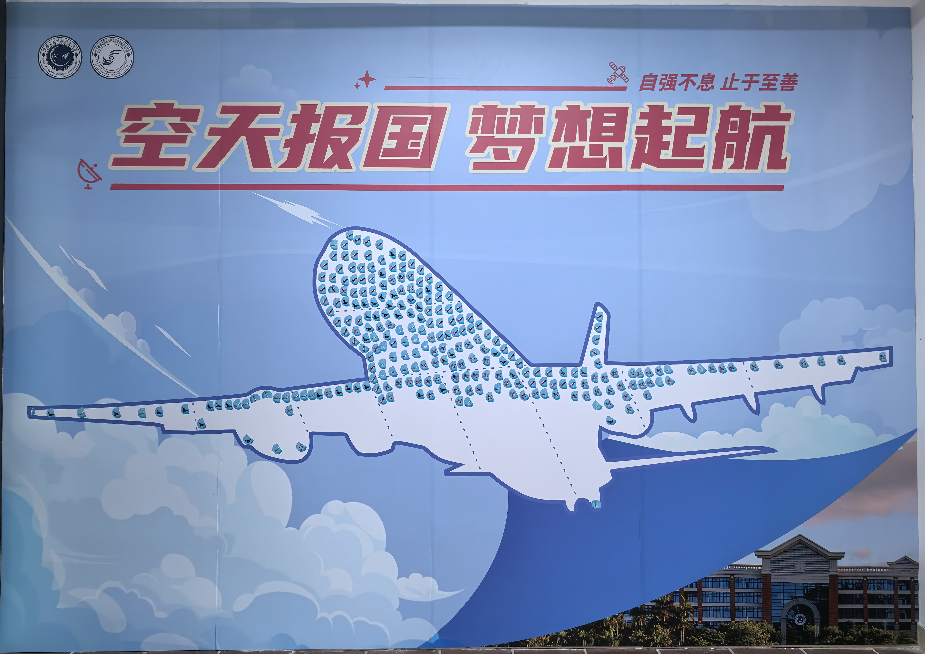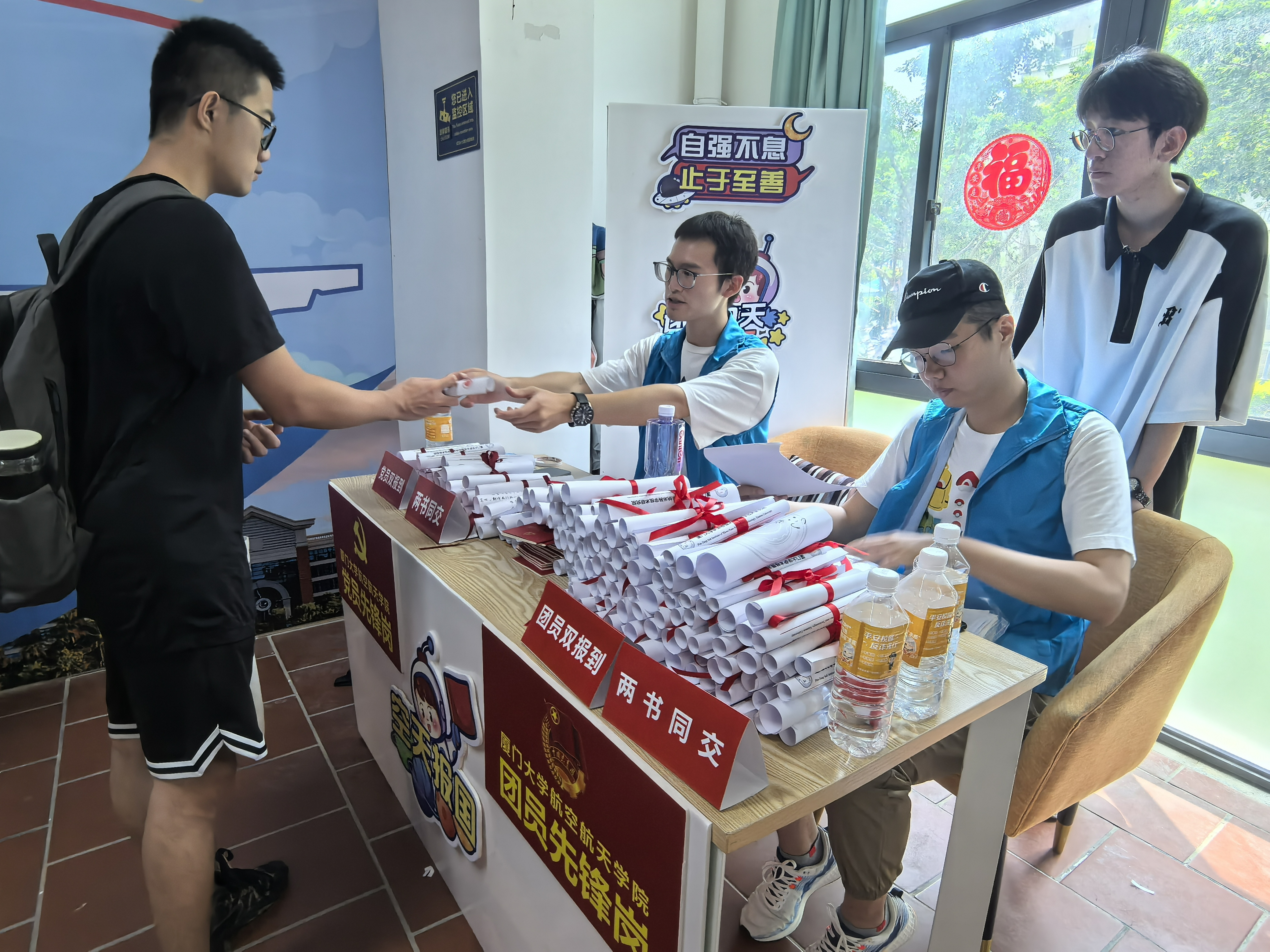“两书同交”双报到是学院迎新的特色活动,新生们积极向学院提交入党申请书、入团申请书,而他们也将收到一封封包含学长学姐寄语的信件,联接着老生与新生,代表着传承。在“空天报国 梦想起航”的大飞机上贴上纪念章,见证空天报国在这里萌芽生长。