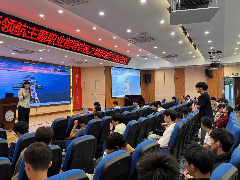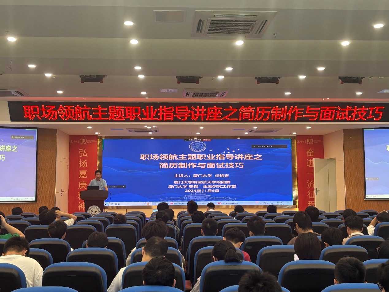 在职场竞争日益激烈的当下,一份出色的简历和一场精彩的面试无疑是开启职业成功之门的金钥匙。为助力正在进行的厦门大学职业规划大赛,同时针对学生在简历制作和面试技巧方面的薄弱环节,助力同学们更好地准备求职之旅, 11 月 6 日,航空航天学院团委特邀学校学生就业创业指导中心生涯发展部负责人任艳青老师在学院报告厅举办“简历制作与面试技巧”讲座。院团委书记郭江淮,副书记倪建超、董佳闻参加活动。讲座采取线上线下相结合的方式,在映雪五一站式空间设立了分会场,吸引了学院300余名学生的积极参与。