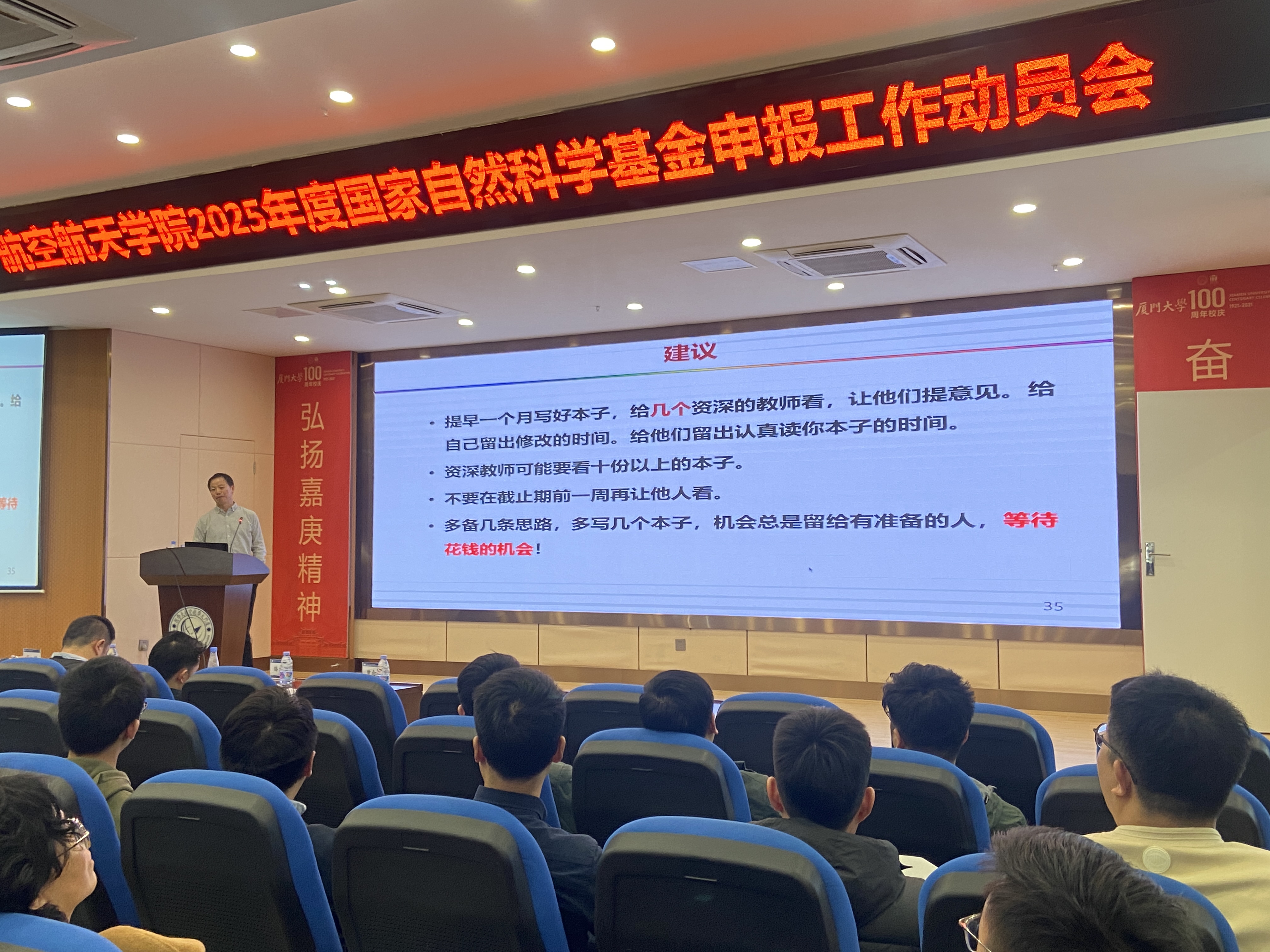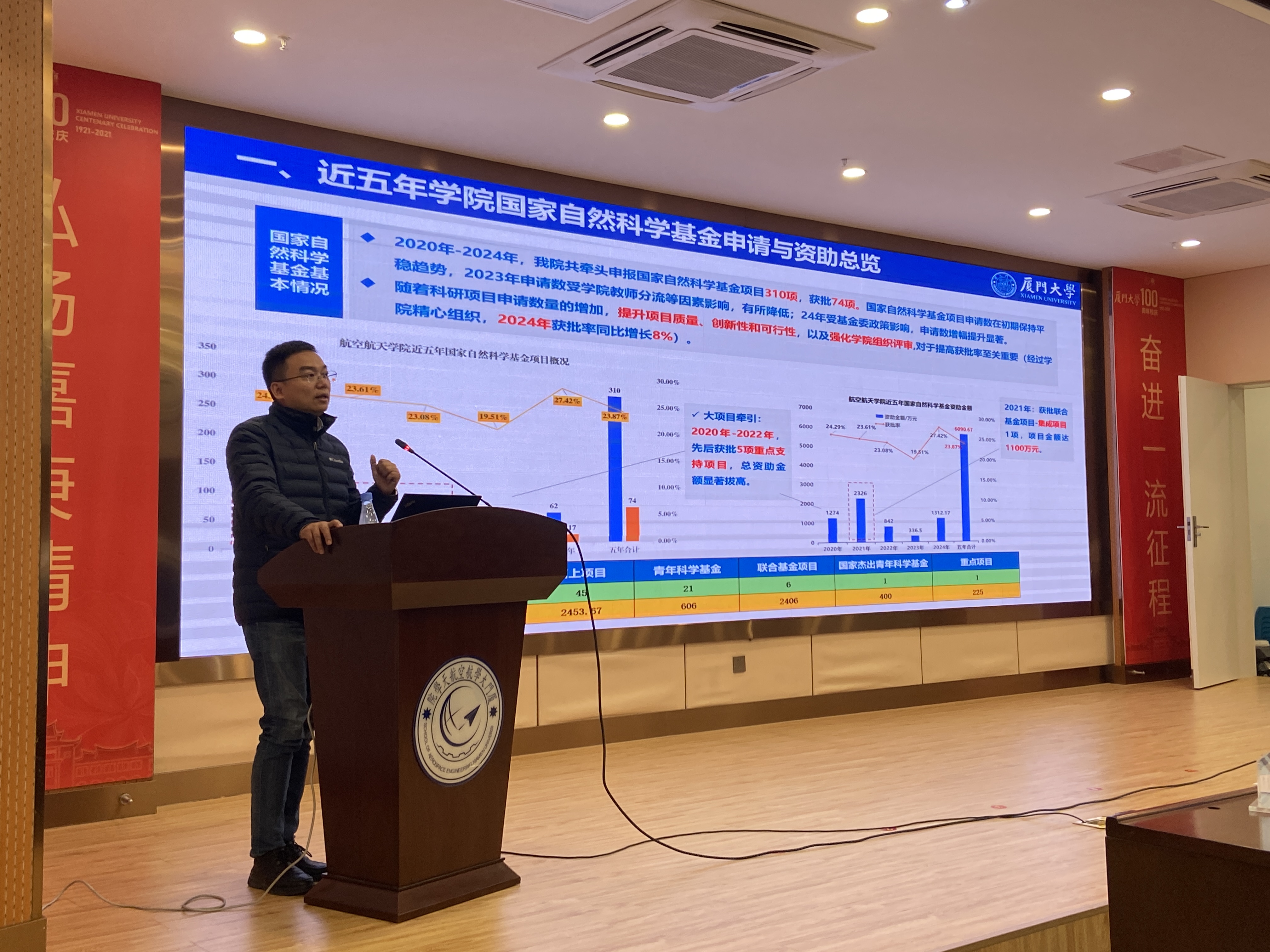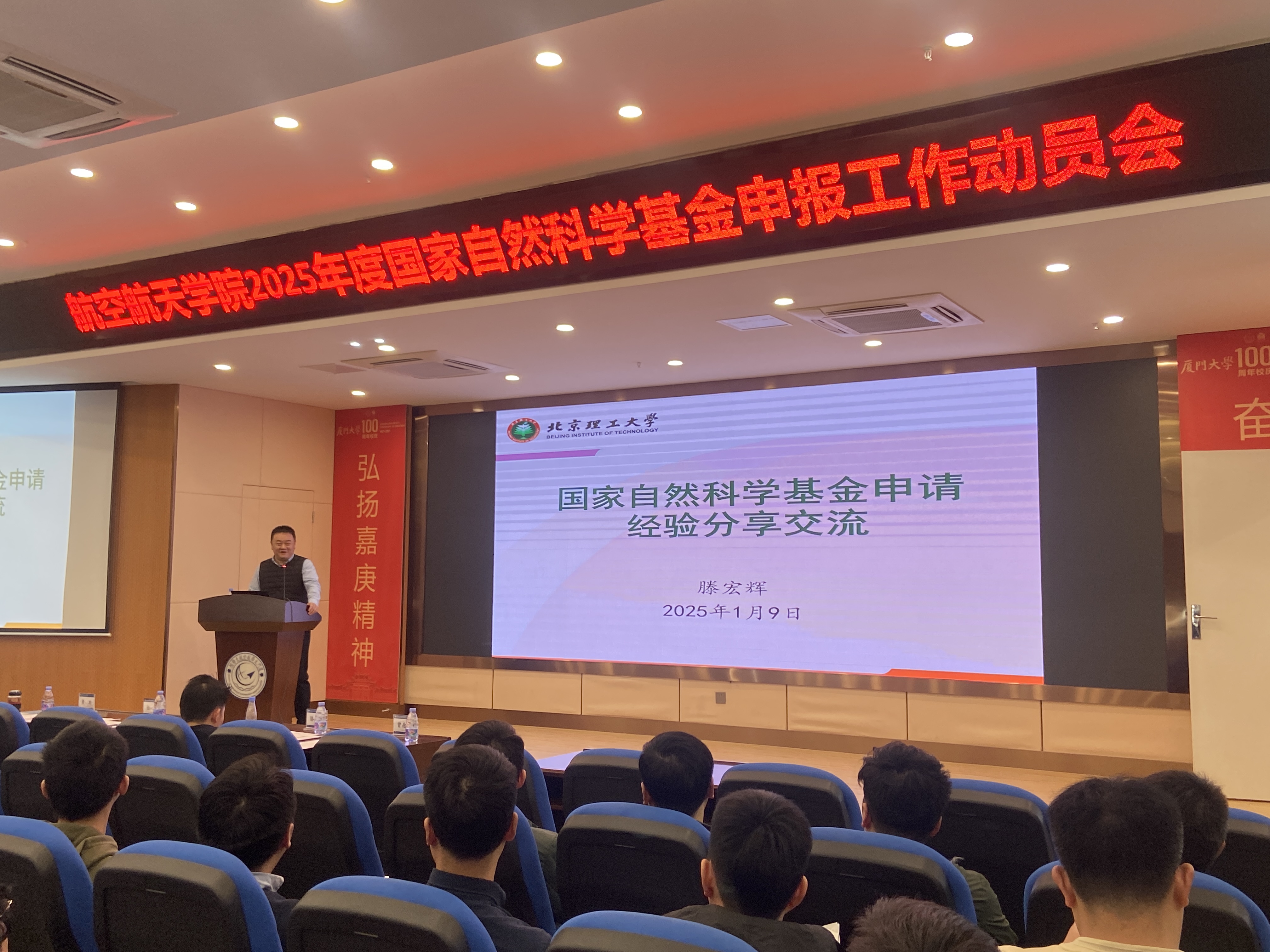 为高效推进2025年度国家自然科学基金项目申报工作,进一步提高学院教师基金项目申报意识和积极性,提升申报书质量,1月9日下午,学院在航空航天大楼547报告厅召开2025年度国家自然科学基金项目申报动员会。此次会议特邀北京理工大学滕宏辉教授、我校化学化工学院院长任斌教授作国家自然科学基金申报经验分享报告。会议由黄玥副院长主持并作动员报告。