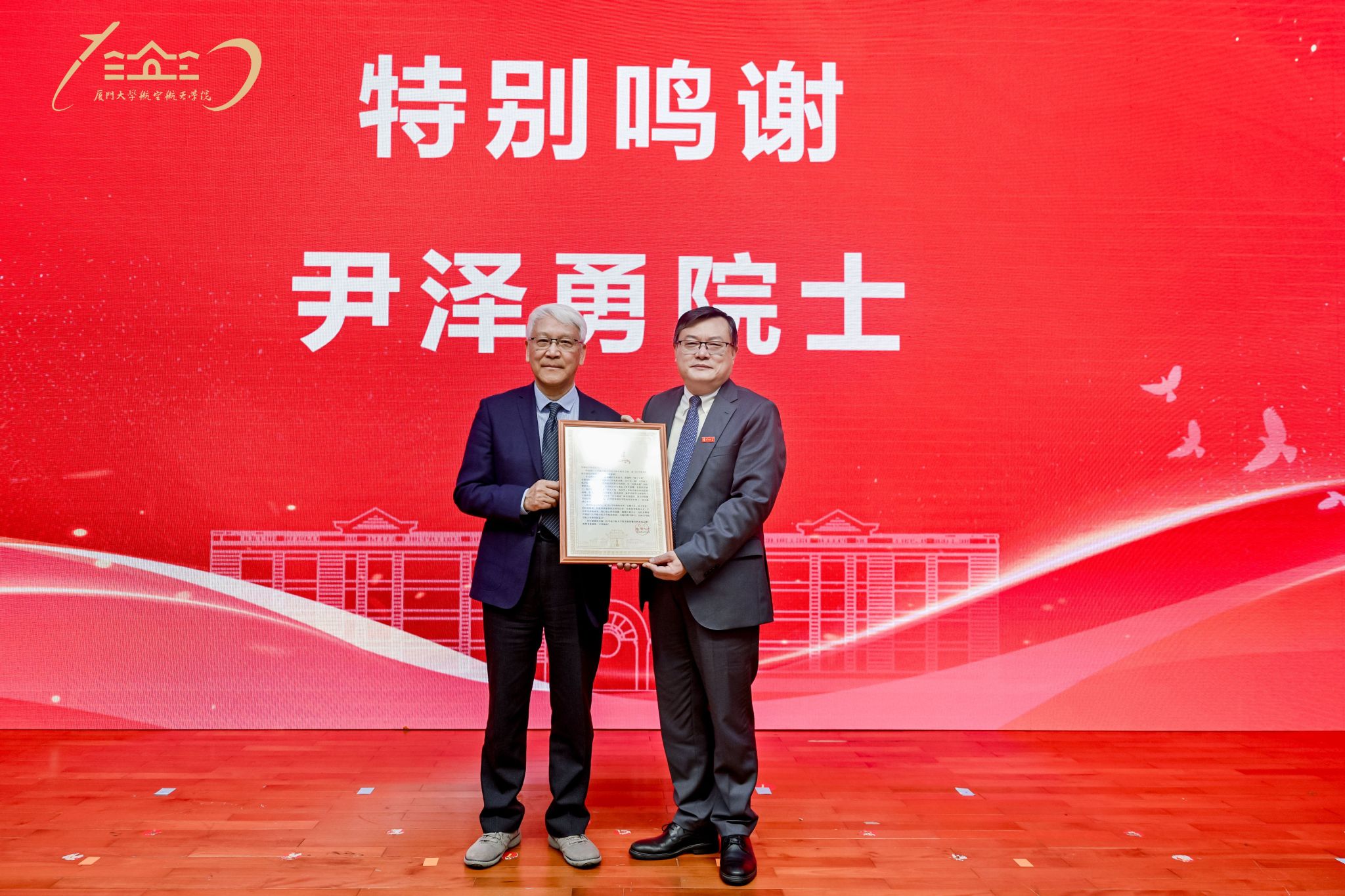 十年来,尹泽勇为学院的成长发展倾情奉献、无问西东,在倾注心血推动学院发展的同时,个人出资发起设立了航空航天学院“积薪”教育发展基金,为学院在人才培养、科学研究、师资建设等各个方面提供强有力支撑。大会设特别鸣谢环节,与会嘉宾共同通过视频,回顾他带领学院笃行不怠、步履不停的十年。张荣代表学校为尹泽勇颁授感谢信。