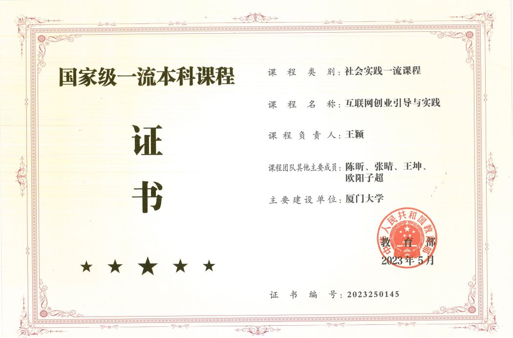 2015年,怀着培养学生创新创业能力的想法,王颖老师与担任班主任时期所带的学生陈昕(现铂欣资本创始合伙人)一拍即合,《互联网创业引导与实践》课程应运而生。这门学生反哺母校的课程至今已开设10次,通过迭代式教学设计、跨学科融合创新与实践场景深度嵌入,构建起理论与应用并重的卓越教学体系。凭借前沿的教学理念与显著育人成效,该课程于2017年获评“福建省创新创业类精品资源共享课程”,2020年获评“福建省社会实践一流课程”,2023年获评“国家级一流本科课程”。